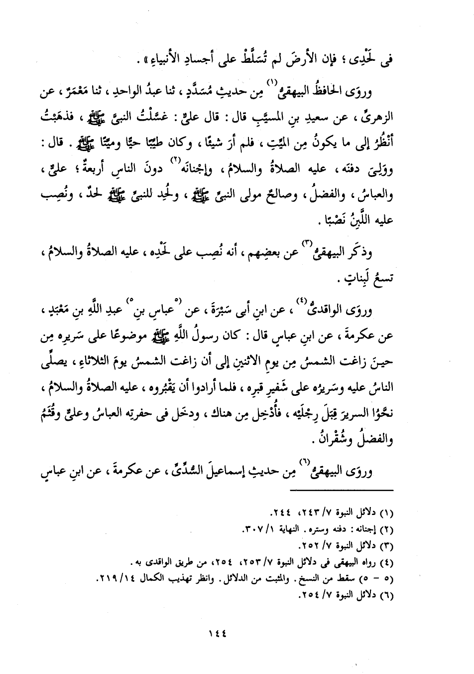 وَرَوَى الْحَافِظُ الْبَيْهَقِيُّ مِنْ حَدِيثِ مُسَدَّدٍ، ثَنَا عَبْدُ الْوَاحِدِ، ثَنَا مَعْمَرٌ، عَنِ الزُّهْرِيِّ، عَنْ سَعِيدِ بْنِ الْمُسَيِّبِ قَالَ: «قَالَ عَلِيٌّ: غَسَّلْتُ النَّبِيَّ صَلَّى اللَّهُ عَلَيْهِ وَسَلَّمَ، فَذَهَبْتُ أَنْظُرُ إِلَى مَا يَكُونُ مِنَ الْمَيِّتِ فَلَمْ أَرَ شَيْئًا، وَكَانَ طَيِّبًا حَيًّا وَمَيِّتًا صَلَّى اللَّهُ عَلَيْهِ وَسَلَّمَ. قَالَ: وَوَلِيَ دَفْنَهُ، عَلَيْهِ الصَّلَاةُ وَالسَّلَامُ، وَإِجْنَانَهُ دُونَ النَّاسِ أَرْبَعَةٌ ; عَلِيٌّ، وَالْعَبَّاسُ، وَالْفَضْلُ، وَصَالِحٌ مَوْلَى النَّبِيِّ صَلَّى اللَّهُ عَلَيْهِ وَسَلَّمَ، وَلُحِدَ لِلنَّبِيِّ صَلَّى اللَّهُ عَلَيْهِ وَسَلَّمَ لَحْدٌ، وَنُصِبَ عَلَيْهِ اللَّبِنُ نَصْبًا» .