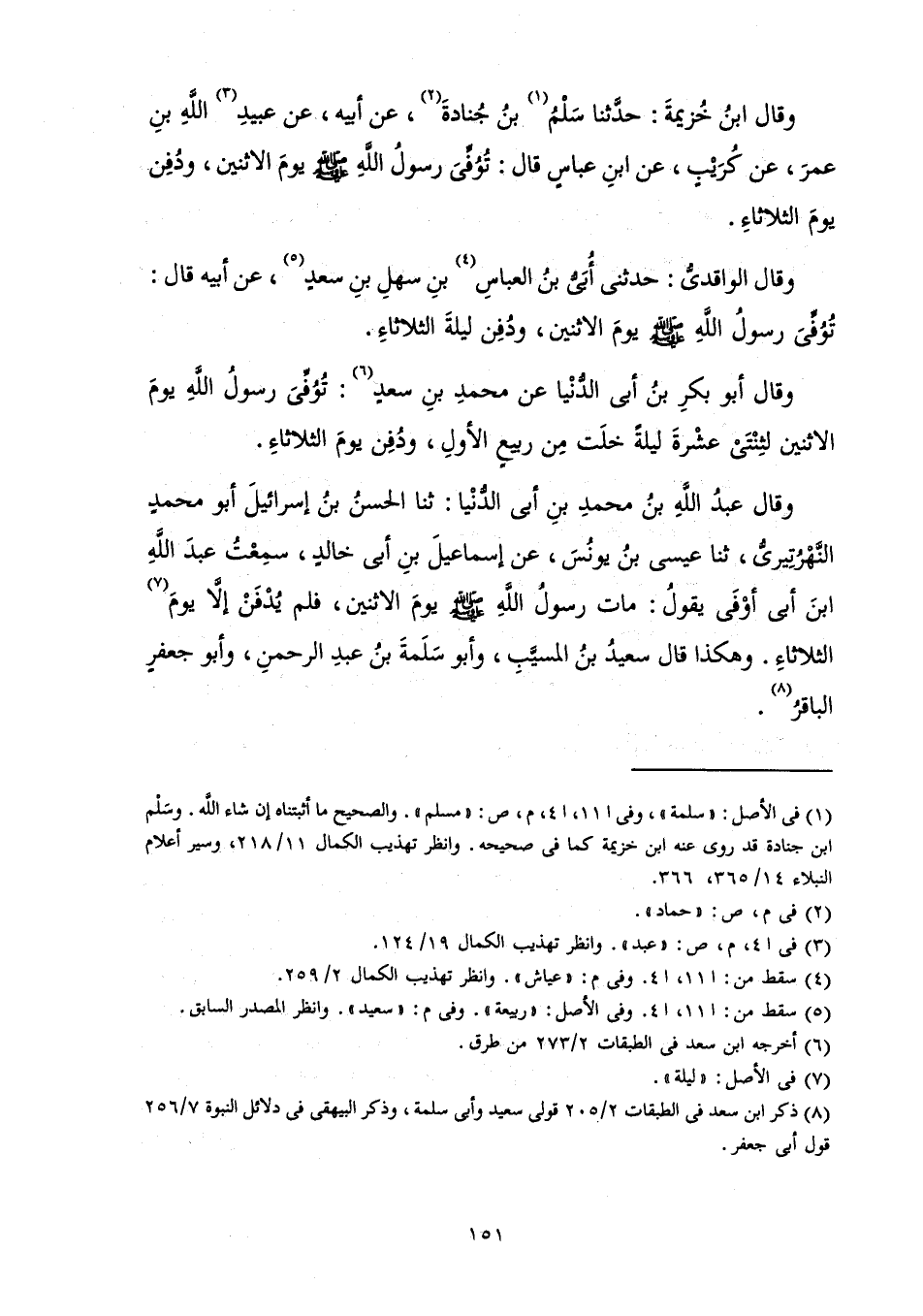 وَقَالَ ابْنُ خُزَيْمَةَ حَدَّثَنَا سَلْمُ بْنُ جُنَادَةَ، عَنْ أَبِيهِ، عَنْ عُبَيْدِ اللَّهِ بْنِ عُمَرَ، عَنْ كُرَيْبٍ، عَنِ ابْنِ عَبَّاسٍ قَالَ: «تُوُفِّيَ رَسُولُ اللَّهِ صَلَّى اللَّهُ عَلَيْهِ وَسَلَّمَ يَوْمَ الِاثْنَيْنِ، وَدُفِنَ يَوْمَ الثُّلَاثَاءِ» .
