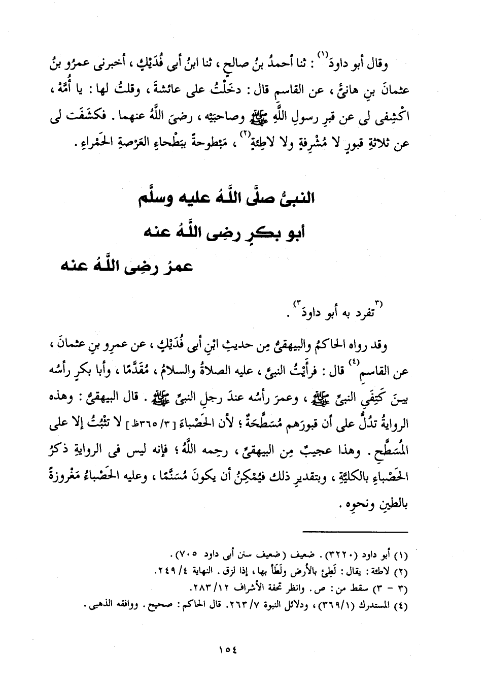 وَقَالَ أَبُو دَاوُدَ: ثَنَا أَحْمَدُ بْنُ صَالِحٍ، ثَنَا ابْنُ أَبِي فُدَيْكٍ، أَخْبَرَنِي عَمْرُو بْنُ عُثْمَانَ بْنِ هَانِئٍ، عَنِ الْقَاسِمِ قَالَ: دَخَلْتُ عَلَى عَائِشَةَ، وَقُلْتُ لَهَا يَا أُمَّهْ، اكْشِفِي لِي عَنْ قَبْرِ رَسُولِ اللَّهِ صَلَّى اللَّهُ عَلَيْهِ وَسَلَّمَ وَصَاحِبَيْهِ، فَكَشَفَتْ لِي عَنْ ثَلَاثَةِ قُبُورٍ لَا مُشْرِفَةٍ وَلَا لَاطِئَةٍ، مَبْطُوحَةٌ بِبَطْحَاءِ الْعَرْصَةِ الْحَمْرَاءِ.