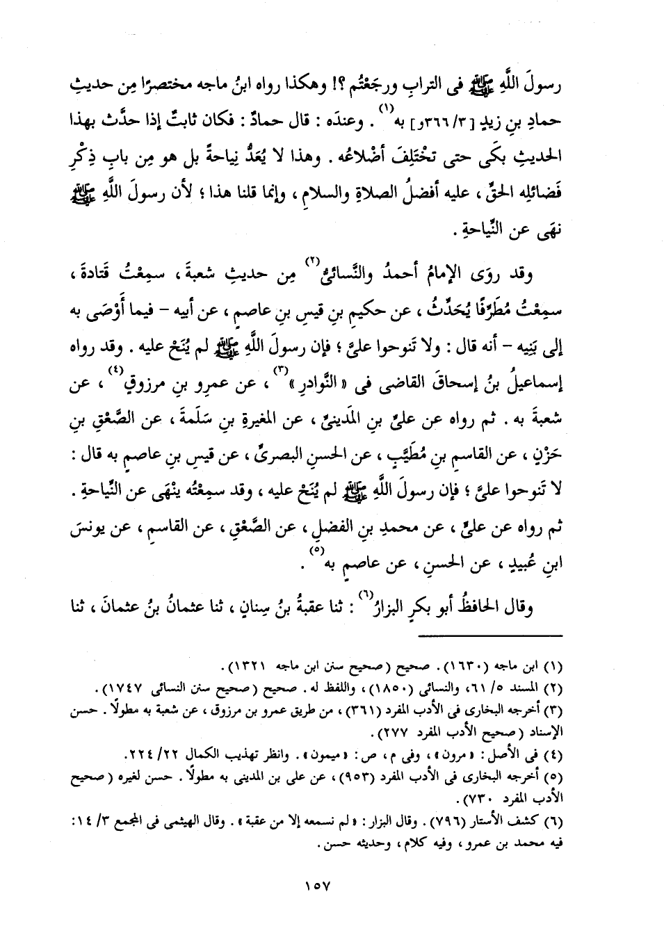 وَقَدْ رَوَى الْإِمَامُ أَحْمَدُ وَالنَّسَائِيُّ مِنْ حَدِيثِ شُعْبَةَ، سَمِعْتُ قَتَادَةَ، سَمِعْتُ مُطَرِّفًا يُحَدِّثُ، عَنْ حَكِيمِ بْنِ قَيْسِ بْنِ عَاصِمٍ، عَنْ أَبِيهِ - فِيمَا أَوْصَى بِهِ إِلَى بَنِيهِ - أَنَّهُ قَالَ: وَلَا تَنُوحُوا عَلَيَّ ; فَإِنَّ رَسُولَ اللَّهِ صَلَّى اللَّهُ عَلَيْهِ وَسَلَّمَ لَمْ يُنَحْ عَلَيْهِ. وَقَدْ رَوَاهُ إِسْمَاعِيلُ بْنُ إِسْحَاقَ الْقَاضِي فِي " النَّوَادِرِ "، عَنْ عَمْرِو بْنِ مَرْزُوقٍ، عَنْ شُعْبَةَ بِهِ. ثُمَّ رَوَاهُ عَنْ عَلِيِّ بْنِ الْمَدِينِيِّ، عَنِ الْمُغِيرَةِ بْنِ سَلَمَةَ، عَنِ الصَّعْقِ بْنِ حَزْنٍ، عَنِ الْقَاسِمِ بْنِ مُطَيَّبٍ، عَنِ الْحَسَنِ الْبَصْرِيِّ، عَنْ قَيْسِ بْنِ عَاصِمٍ بِهِ قَالَ: لَا تَنُوحُوا عَلَيَّ فَإِنَّ رَسُولَ اللَّهِ صَلَّى اللَّهُ عَلَيْهِ وَسَلَّمَ لَمْ يُنَحْ عَلَيْهِ، وَقَدْ سَمِعْتُهُ يَنْهَى عَنِ النِّيَاحَةِ. ثُمَّ رَوَاهُ عَنْ عَلِيٍّ، عَنْ مُحَمَّدِ بْنِ الْفَضْلِ، عَنِ الصَّعْقِ، عَنِ الْقَاسِمِ، عَنْ يُونُسَ بْنِ عُبَيْدٍ، عَنِ الْحَسَنِ، عَنْ عَاصِمٍ بِهِ.