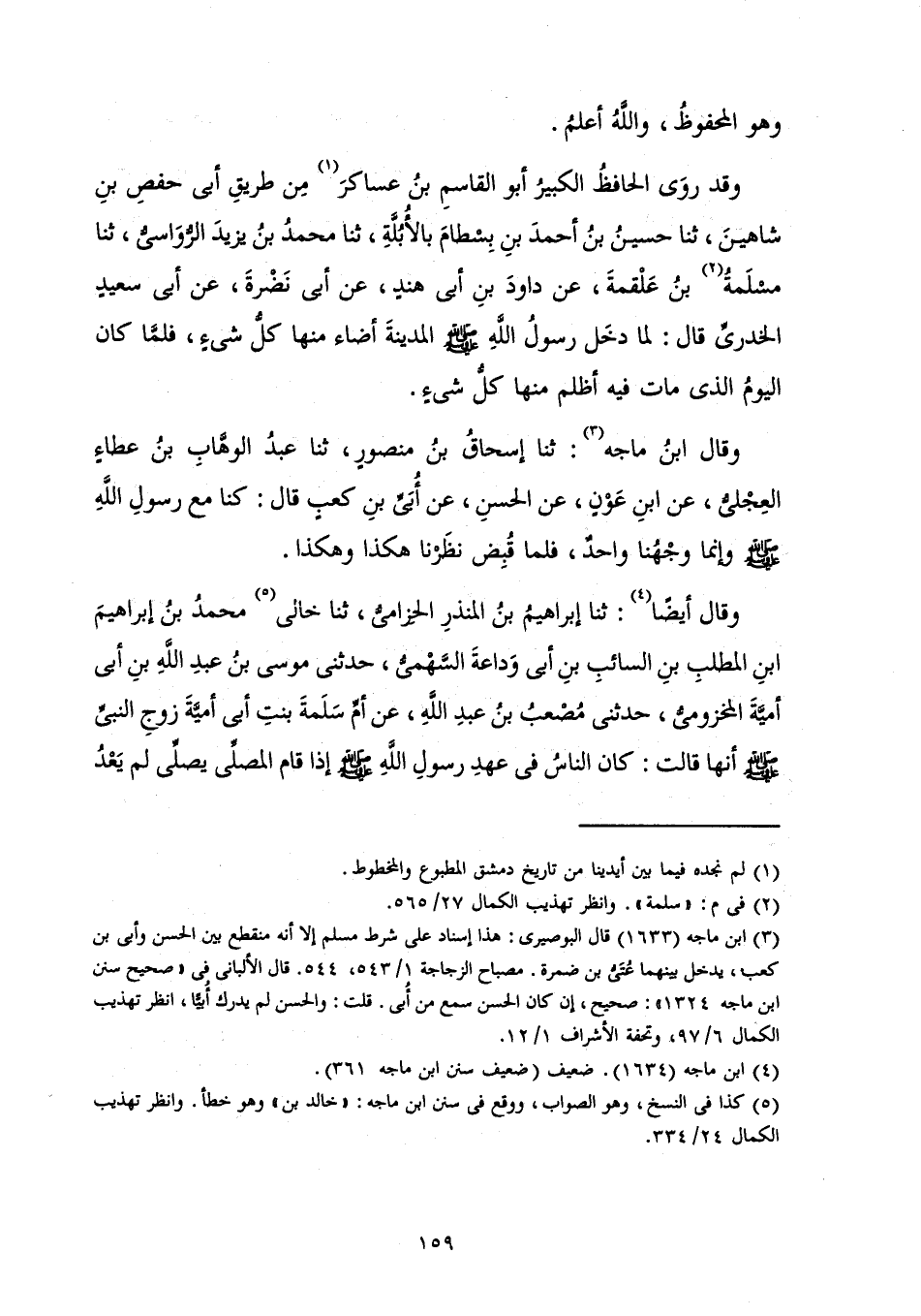 وَقَدْ رَوَى الْحَافِظُ الْكَبِيرُ أَبُو الْقَاسِمِ بْنُ عَسَاكِرَ مِنْ طَرِيقِ أَبِي حَفْصِ بْنِ شَاهِينَ، ثَنَا حُسَيْنُ بْنُ أَحْمَدَ بْنِ بِسْطَامَ بِالْأُبُلَّةِ، ثَنَا مُحَمَّدُ بْنُ يَزِيدَ الرُّوَاسِيُّ، ثَنَا مَسْلَمَةُ بْنُ عَلْقَمَةَ، عَنْ دَاوُدَ بْنِ أَبِي هِنْدٍ، عَنْ أَبِي نَضْرَةَ، عَنْ أَبِي سَعِيدٍ الْخُدْرِيِّ قَالَ: «لَمَّا دَخَلَ رَسُولُ اللَّهِ صَلَّى اللَّهُ عَلَيْهِ وَسَلَّمَ الْمَدِينَةَ أَضَاءَ مِنْهَا كُلُّ شَيْءٍ، فَلَمَّا كَانَ الْيَوْمُ الَّذِي مَاتَ فِيهِ أَظْلَمَ مِنْهَا كُلُّ شَيْءٍ» .