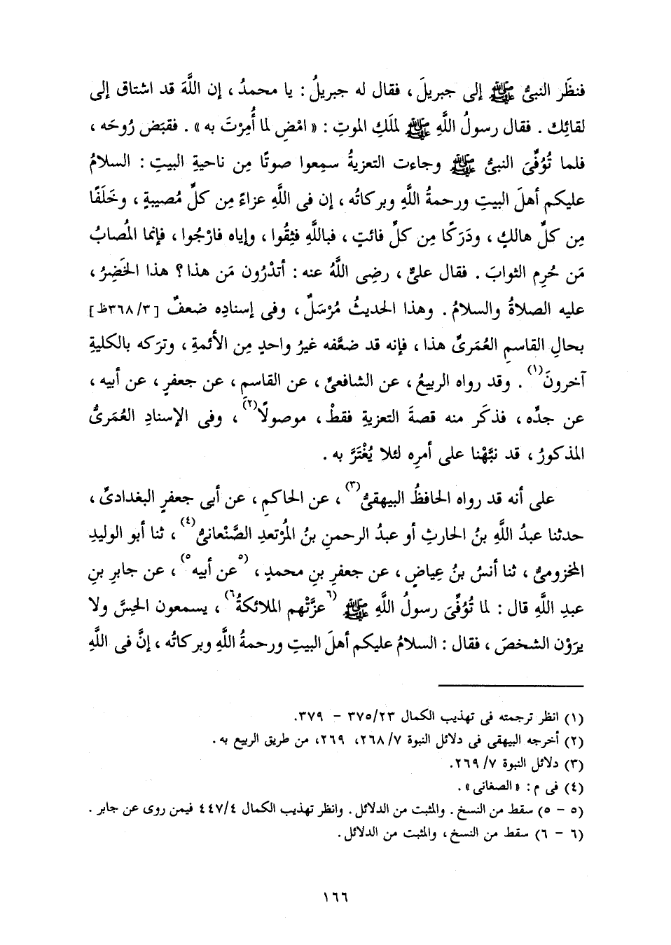 عَلَى أَنَّهُ قَدْ رَوَاهُ الْحَافِظُ الْبَيْهَقِيُّ، عَنِ الْحَاكِمِ، عَنْ أَبِي جَعْفَرٍ الْبَغْدَادِيِّ، حَدَّثَنَا عَبْدُ اللَّهِ بْنُ الْحَارِثِ أَوْ عَبْدُ الرَّحْمَنِ بْنُ الْمُرْتَعِدِ الصَّنْعَانِيُّ، ثَنَا أَبُو الْوَلِيدِ الْمَخْزُومِيُّ، ثَنَا أَنَسُ بْنُ عِيَاضٍ، عَنْ جَعْفَرِ بْنِ مُحَمَّدٍ، عَنْ أَبِيهِ، عَنْ جَابِرِ بْنِ عَبْدِ اللَّهِ قَالَ: لَمَّا تُوُفِّيَ رَسُولُ اللَّهِ صَلَّى اللَّهُ عَلَيْهِ وَسَلَّمَ عَزَّتْهُمُ الْمَلَائِكَةُ، يَسْمَعُونَ الْحِسَّ وَلَا يَرَوْنَ الشَّخْصَ، فَقَالَ: السَّلَامُ عَلَيْكُمْ أَهْلَ الْبَيْتِ وَرَحْمَةُ اللَّهِ وَبَرَكَاتُهُ، إِنَّ فِي اللَّهِ