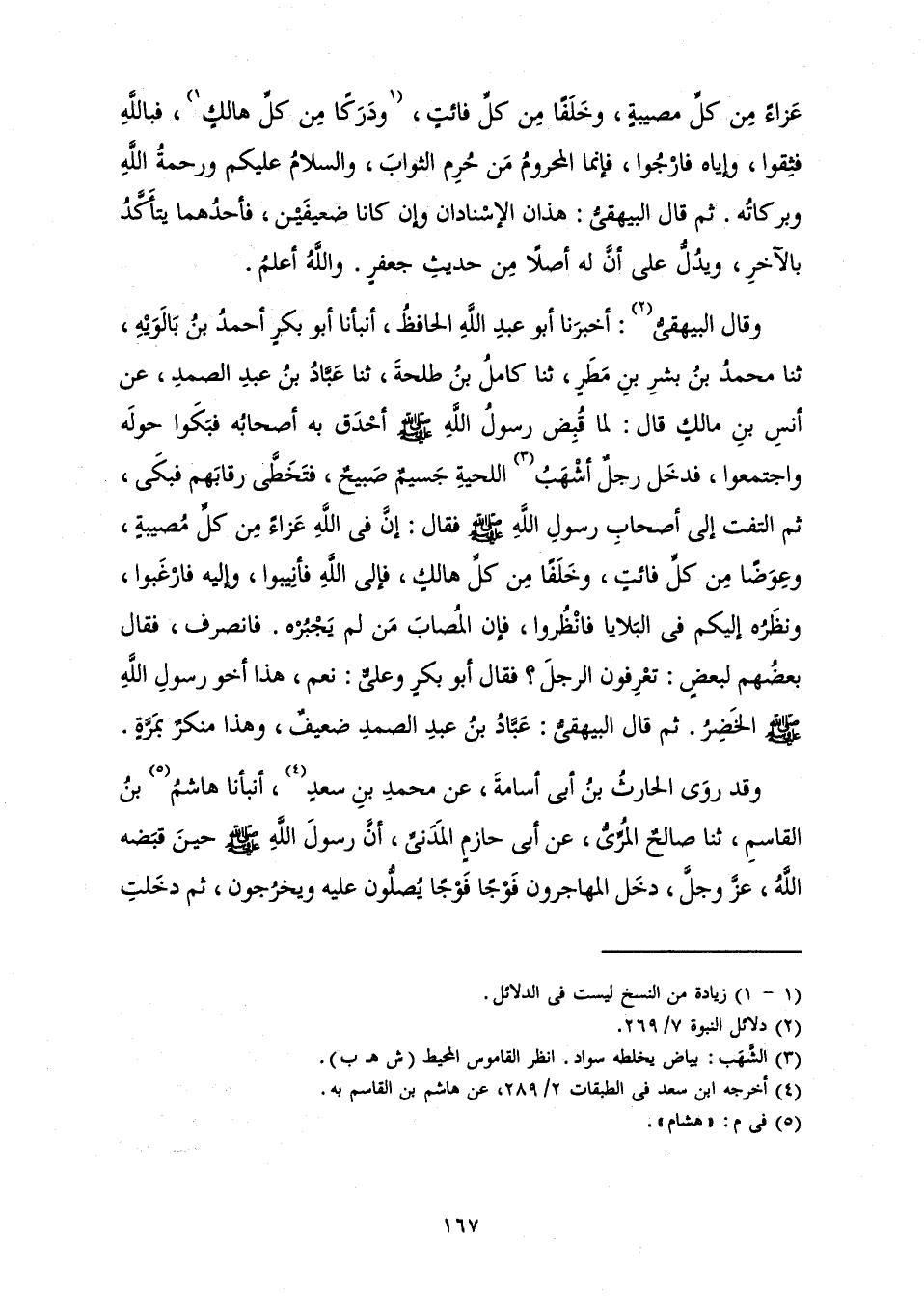 عَزَاءً مَنْ كُلِّ مُصِيبَةٍ، وَخَلَفًا مَنْ كُلِّ فَائِتٍ، وَدَرَكًا مَنْ كُلِّ هَالِكٍ، فَبِاللَّهِ فَثِقُوا، وَإِيَّاهُ فَارْجُوا، فَإِنَّمَا الْمَحْرُومُ مَنْ حُرِمَ الثَّوَابَ، وَالسَّلَامُ عَلَيْكُمْ وَرَحْمَةُ اللَّهِ وَبَرَكَاتُهُ. ثُمَّ قَالَ الْبَيْهَقِيُّ: هَذَانَ الْإِسْنَادَانِ وَإِنْ كَانَا ضَعِيفَيْنِ، فَأَحَدُهُمَا يَتَأَكَّدُ بِالْآخَرِ، وَيَدُلُّ عَلَى أَنَّ لَهُ أَصْلًا مِنْ حَدِيثِ جَعْفَرٍ. وَاللَّهُ أَعْلَمُ.