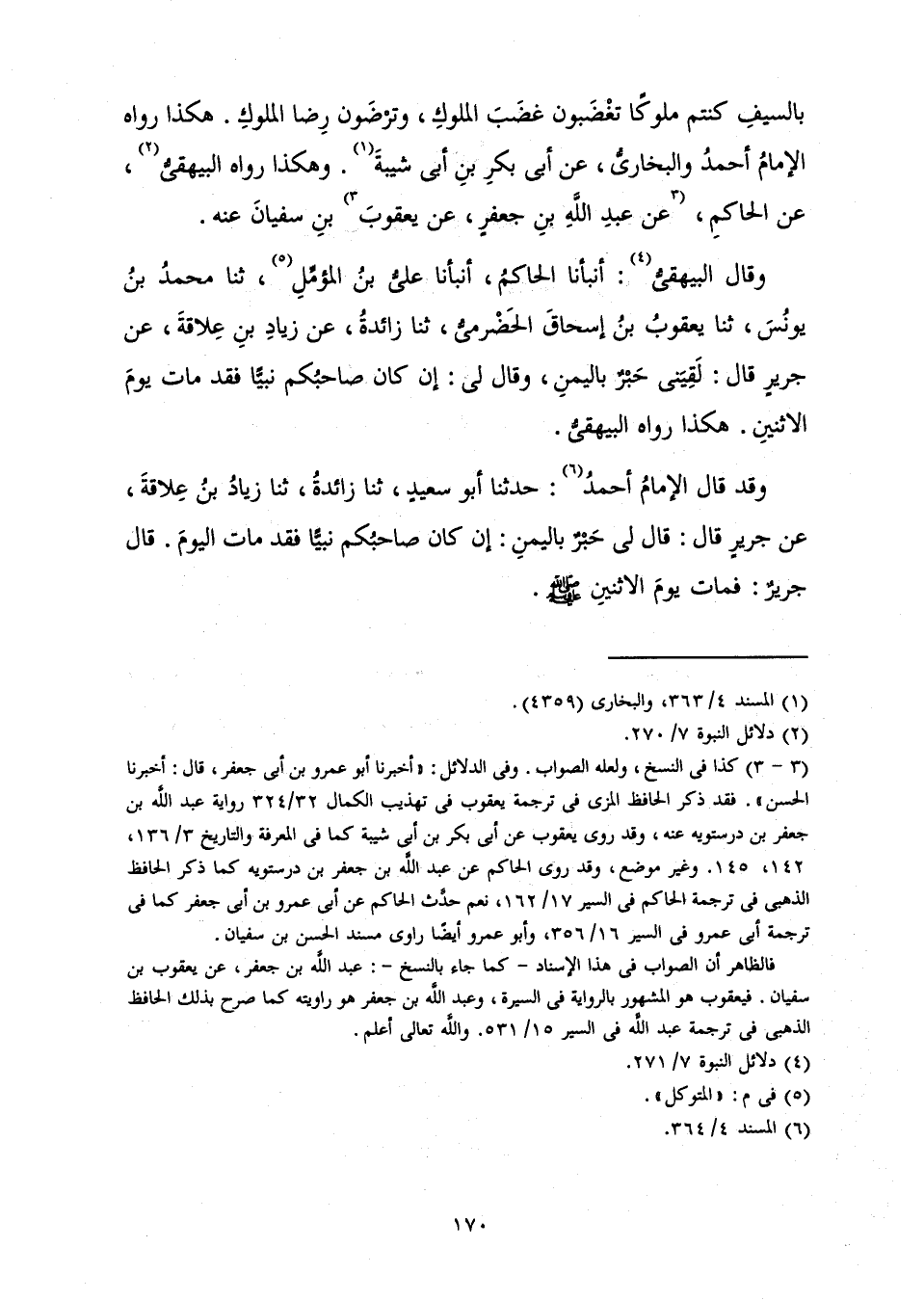 وَقَالَ الْبَيْهَقِيُّ: أَنْبَأَنَا الْحَاكِمُ، أَنْبَأَنَا عَلِيُّ بْنُ الْمُؤَمَّلِ ثَنَا مُحَمَّدُ بْنُ يُونُسَ ثَنَا يَعْقُوبُ بْنُ إِسْحَاقَ الْحَضْرَمِيُّ، ثَنَا زَائِدَةُ، عَنْ زِيَادِ بْنِ عِلَاقَةَ، عَنْ جَرِيرٍ قَالَ: لَقِيَنِي حَبْرٌ بِالْيَمَنِ، وَقَالَ لِي: إِنْ كَانَ صَاحِبُكُمْ نَبِيًّا فَقَدْ مَاتَ يَوْمَ الِاثْنَيْنِ. هَكَذَا رَوَاهُ الْبَيْهَقِيُّ.