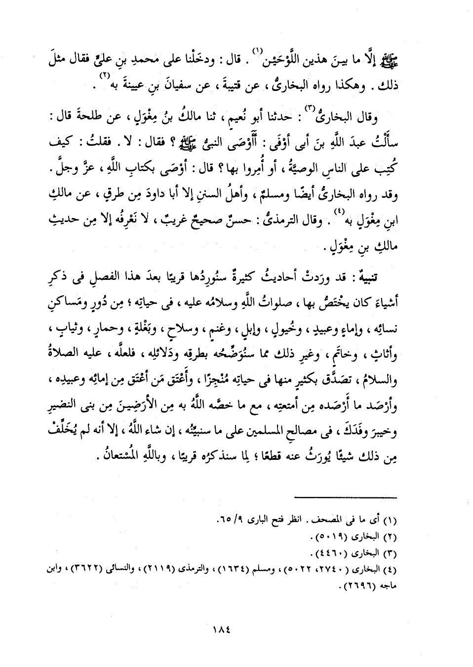 وَقَالَ الْبُخَارِيُّ: حَدَّثَنَا أَبُو نُعَيْمٍ ثَنَا مَالِكُ بْنُ مِغْوَلٍ عَنْ طَلْحَةَ قَالَ: سَأَلْتُ عَبْدَ اللَّهِ بْنَ أَبِي أَوْفَى «أَأَوْصَى النَّبِيُّ صَلَّى اللَّهُ عَلَيْهِ وَسَلَّمَ؟ فَقَالَ: لَا. فَقُلْتُ: كَيْفَ كُتِبَ عَلَى النَّاسِ الْوَصِيَّةُ أَوْ أُمِرُوا بِهَا؟ قَالَ أَوْصَى بِكِتَابِ اللَّهِ عَزَّ وَجَلَّ» . وَقَدْ رَوَاهُ الْبُخَارِيُّ أَيْضًا وَمُسْلِمٌ، وَأَهْلُ السُّنَنِ إِلَّا أَبَا دَاوُدَ مِنْ طُرُقٍ، عَنْ مَالِكِ بْنِ مِغْوَلٍ بِهِ. وَقَالَ التِّرْمِذِيُّ: حَسَنٌ صَحِيحٌ غَرِيبٌ، لَا نَعْرِفُهُ إِلَّا مِنْ حَدِيثِ مَالِكِ بْنِ مِغْوَلٍ.