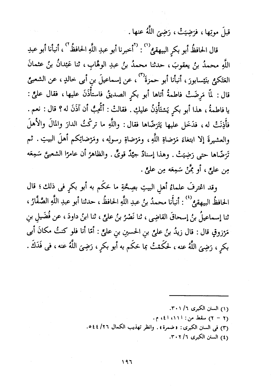 قَالَ الْحَافِظُ أَبُو بَكْرٍ الْبَيْهَقِيُّ: أَخْبَرَنَا أَبُو عَبْدِ اللَّهِ الْحَافِظُ، أَنْبَأَنَا أَبُو عَبْدِ اللَّهِ مُحَمَّدُ بْنُ يَعْقُوبَ، حَدَّثَنَا مُحَمَّدُ بْنُ عَبْدِ الْوَهَّابِ، ثَنَا عَبْدَانُ بْنُ عُثْمَانَ الْعَتَكِيُّ بِنَيْسَابُورَ، أَنْبَأَنَا أَبُو حَمْزَةَ، عَنْ إِسْمَاعِيلَ بْنِ أَبِي خَالِدٍ، عَنِ الشَّعْبِيِّ قَالَ: لَمَّا مَرِضَتْ فَاطِمَةُ أَتَاهَا أَبُو بَكْرٍ الصِّدِّيقُ فَاسْتَأْذَنَ عَلَيْهَا، فَقَالَ عَلِيٌّ: يَا فَاطِمَةُ، هَذَا أَبُو بَكْرٍ يَسْتَأْذِنُ عَلَيْكِ. فَقَالَتْ: أَتُحِبُّ أَنْ آذَنَ لَهُ؟ قَالَ: نَعَمْ. فَأَذِنَتْ لَهُ، فَدَخَلَ عَلَيْهَا يَتَرَضَّاهَا فَقَالَ: وَاللَّهِ مَا تَرَكْتُ الدَّارَ وَالْمَالَ وَالْأَهْلَ وَالْعَشِيرَةَ إِلَّا ابْتِغَاءَ مَرْضَاةِ اللَّهِ، وَمَرْضَاةِ رَسُولِهِ، وَمَرْضَاتِكُمْ أَهْلَ الْبَيْتِ. ثُمَّ تَرَضَّاهَا حَتَّى رَضِيَتْ. وَهَذَا إِسْنَادٌ جَيِّدٌ قَوِيٌّ. وَالظَّاهِرُ أَنَّ عَامِرًا الشَّعْبِيَّ سَمِعَهُ مِنْ عَلِيٍّ، أَوْ مِمَّنْ سَمِعَهُ مِنْ عَلِيٍّ.