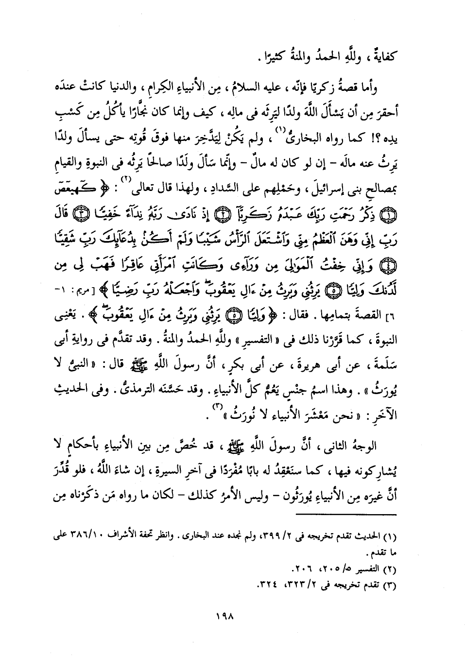 وَأَمَّا قِصَّةُ زَكَرِيَّا فَإِنَّهُ، عَلَيْهِ السَّلَامُ، مِنَ الْأَنْبِيَاءِ الْكِرَامِ، وَالدُّنْيَا كَانَتْ عِنْدَهُ أَحْقَرَ مِنْ أَنْ يَسْأَلَ اللَّهَ وَلَدًا لِيَرِثَهُ فِي مَالِهِ، كَيْفَ وَإِنَّمَا كَانَ نَجَّارًا يَأْكُلُ مَنْ كَسْبِ يَدِهِ؟ ! كَمَا رَوَاهُ الْبُخَارِيُّ، وَلَمْ يَكُنْ لِيَدَّخِرَ مِنْهَا فَوْقَ قُوتِهِ حَتَّى يَسْأَلَ وَلَدًا يَرِثُ عَنْهُ مَالَهُ - إِنْ لَوْ كَانَ لَهُ مَالٌ - وَإِنَّمَا سَأَلَ وَلَدًا صَالِحًا يَرِثُهُ فِي النُّبُوَّةِ وَالْقِيَامِ بِمَصَالِحِ بَنِي إِسْرَائِيلَ، وَحَمْلِهِمْ عَلَى السَّدَادِ، وَلِهَذَا قَالَ تَعَالَى: {كهيعص ذِكْرُ رَحْمَةِ رَبِّكَ عَبْدَهُ زَكَرِيَّا إِذْ نَادَى رَبَّهُ نِدَاءً خَفِيًّا قَالَ رَبِّ إِنِّي وَهَنَ الْعَظْمُ مِنِّي وَاشْتَعَلَ الرَّأْسُ شَيْبًا وَلَمْ أَكُنْ بِدُعَائِكَ رَبِّ شَقِيًّا وَإِنِّي خِفْتُ الْمَوَالِيَ مِنْ وَرَائِي وَكَانَتِ امْرَأَتِي عَاقِرًا فَهَبْ لِي مِنْ لَدُنْكَ وَلِيًّا يَرِثُنِي وَيَرِثُ مِنْ آلِ يَعْقُوبَ وَاجْعَلْهُ رَبِّ رَضِيًّا} [مريم: 1] يَعْنِي النُّبُوَّةَ كَمَا قَرَّرْنَا ذَلِكَ فِي " التَّفْسِيرِ " وَلِلَّهِ الْحَمْدُ وَالْمِنَّةُ. وَقَدْ تَقَدَّمَ فِي رِوَايَةِ أَبِي سَلَمَةَ، عَنْ أَبِي هُرَيْرَةَ، عَنْ أَبِي بَكْرٍ، أَنَّ رَسُولَ اللَّهِ صَلَّى اللَّهُ عَلَيْهِ وَسَلَّمَ قَالَ: «النَّبِيُّ لَا يُورَثُ» وَهَذَا اسْمُ جِنْسٍ يَعُمُّ كُلَّ الْأَنْبِيَاءِ. وَقَدْ حَسَّنَهُ التِّرْمِذِيُّ. وَفِي الْحَدِيثِ الْآخَرِ «: " نَحْنُ مَعْشَرَ الْأَنْبِيَاءِ لَا نُورَثُ» .