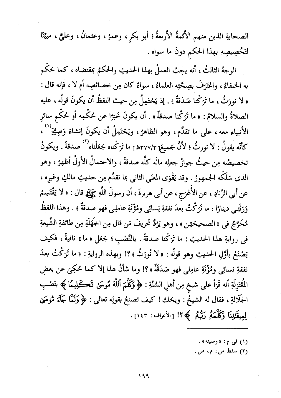 الْوَجْهُ الثَّالِثُ، أَنَّهُ يَجِبُ الْعَمَلُ بِهَذَا الْحَدِيثِ وَالْحُكْمُ بِمُقْتَضَاهُ، كَمَا حَكَمَ بِهِ الْخُلَفَاءُ، وَاعْتَرَفَ بِصِحَّتِهِ الْعُلَمَاءُ، سَوَاءٌ كَانَ مِنْ خَصَائِصِهِ أَمْ لَا، فَإِنَّهُ قَالَ: «لَا نُورَثُ، مَا تَرَكْنَا صَدَقَةٌ» إِذْ يَحْتَمِلُ مِنْ حَيْثُ اللَّفْظُ أَنْ يَكُونَ قَوْلُهُ، عَلَيْهِ الصَّلَاةُ وَالسَّلَامُ «مَا تَرَكْنَا صَدَقَةٌ» أَنْ يَكُونَ خَبَرًا عَنْ حُكْمِهِ أَوْ حُكْمِ سَائِرِ الْأَنْبِيَاءِ مَعَهُ، عَلَى مَا تَقَدَّمَ، وَهُوَ الظَّاهِرُ، وَيَحْتَمِلُ أَنْ يَكُونَ إِنْشَاءَ وَصِيَّةٍ، كَأَنَّهُ يَقُولُ: لَا نُورَثُ ; لِأَنَّ جَمِيعَ مَا تَرَكْنَاهُ صَدَقَةٌ. وَيَكُونُ تَخْصِيصُهُ مِنْ حَيْثُ جَوَازُ جَعْلِهِ مَالَهُ كُلَّهُ صَدَقَةً، وَالِاحْتِمَالُ الْأَوَّلُ أَظْهَرُ، وَهُوَ الَّذِي سَلَكَهُ الْجُمْهُورُ. وَقَدْ يَقْوَى الْمَعْنَى الثَّانِي بِمَا تَقَدَّمَ مِنْ حَدِيثِ مَالِكٍ وَغَيْرِهِ، عَنْ أَبِي الزِّنَادِ، عَنِ الْأَعْرَجِ، عَنْ أَبِي هُرَيْرَةَ أَنَّ رَسُولَ اللَّهِ صَلَّى اللَّهُ عَلَيْهِ وَسَلَّمَ قَالَ «لَا يَقْتَسِمُ وَرَثَتِي دِينَارًا، مَا تَرَكْتُ بَعْدَ نَفَقَةِ نِسَائِي وَمُؤْنَةِ عَامِلِي فَهُوَ صَدَقَةٌ» وَهَذَا اللَّفْظُ مُخَرَّجٌ فِي " الصَّحِيحَيْنِ "، وَهُوَ يَرَدُّ تَحْرِيفَ مَنْ قَالَ مِنَ الْجَهَلَةِ مِنْ طَائِفَةِ الشِّيعَةِ فِي رِوَايَةِ هَذَا الْحَدِيثِ " مَا تَرَكْنَا صَدَقَةً ". بِالنَّصْبِ ; جَعَلَ " مَا " نَافِيَةً فَكَيْفَ يَصْنَعُ بِأَوَّلِ الْحَدِيثِ وَهُوَ قَوْلُهُ " لَا نُورَثُ "؟ ! وَبِهَذِهِ الرِّوَايَةِ: «مَا تَرَكْتُ بَعْدَ نَفَقَةِ نِسَائِي وَمُؤْنَةِ عَامِلِي فَهُوَ صَدَقَةٌ "؟ !» وَمَا شَأْنُ هَذَا إِلَّا كَمَا حُكِيَ عَنْ بَعْضِ الْمُعْتَزِلَةِ أَنَّهُ قَرَأَ عَلَى شَيْخٍ مِنْ أَهْلِ السُّنَّةِ: {وَكَلَّمَ اللَّهُ مُوسَى تَكْلِيمًا} [النساء: 164] بِنَصْبِ الْجَلَالَةِ، فَقَالَ لَهُ الشَّيْخُ: وَيْحَكَ! كَيْفَ تَصْنَعُ بِقَوْلِهِ تَعَالَى: {وَلَمَّا جَاءَ مُوسَى لِمِيقَاتِنَا وَكَلَّمَهُ رَبُّهُ} [الأعراف: 143] . [الْأَعْرَافِ: 143]
