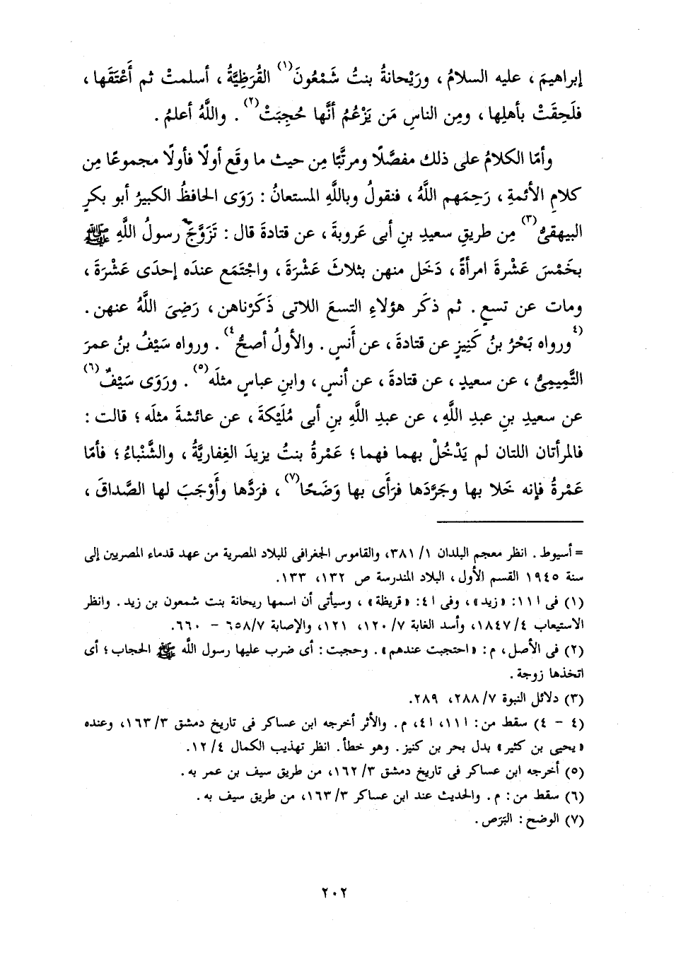وَأَمَّا الْكَلَامُ عَلَى ذَلِكَ مُفَصَّلًا وَمُرَتَّبًا مِنْ حَيْثُ مَا وَقَعَ أَوَّلًا فَأَوَّلًا مَجْمُوعًا مِنْ كَلَامِ الْأَئِمَّةِ، رَحِمَهُمُ اللَّهُ، فَنَقُولُ وَبِاللَّهِ الْمُسْتَعَانُ: رَوَى الْحَافِظُ الْكَبِيرُ أَبُو بَكْرٍ الْبَيْهَقِيُّ مِنْ طَرِيقِ سَعِيدِ بْنِ أَبِي عَرُوبَةَ، عَنْ قَتَادَةَ قَالَ تَزَوَّجَ رَسُولُ اللَّهِ صَلَّى اللَّهُ عَلَيْهِ وَسَلَّمَ بِخَمْسَ عَشْرَةَ امْرَأَةً، دَخَلَ مِنْهُنَّ بِثَلَاثَ عَشْرَةَ، وَاجْتَمَعَ عِنْدَهُ إِحْدَى عَشْرَةَ، وَمَاتَ عَنْ تِسْعٍ. ثُمَّ ذَكَرَ هَؤُلَاءِ التِّسْعَ اللَّاتِي ذَكَرْنَاهُنَّ، رَضِيَ اللَّهُ عَنْهُنَّ. وَرَوَاهُ بَحْرُ بْنُ كَنِيزٍ عَنْ قَتَادَةَ، عَنْ أَنَسٍ. وَالْأَوَّلُ أَصَحُّ. وَرَوَاهُ سَيْفُ بْنُ عُمَرَ التَّمِيمِيُّ، عَنْ سَعِيدٍ، عَنْ قَتَادَةَ، عَنْ أَنَسٍ، وَابْنِ عَبَّاسٍ مِثْلَهُ. وَرَوَى سَيْفٌ عَنْ سَعِيدِ بْنِ عَبْدِ اللَّهِ، عَنْ عَبْدِ اللَّهِ بْنِ أَبِي مُلَيْكَةَ، «عَنْ عَائِشَةَ مِثْلَهُ ; قَالَتْ: فَالْمَرْأَتَانِ اللَّتَانِ لَمَّ يَدْخُلْ بِهِمَا فَهُمَا ; عَمْرَةُ بِنْتُ يَزِيدَ الْغِفَارِيَّةُ، وَالشَّنْبَاءُ ; فَأَمَّا عَمْرَةُ فَإِنَّهُ خَلَا بِهَا وَجَرَّدَهَا فَرَأَى بِهَا وَضَحًا، فَرَدَّهَا وَأَوْجَبَ لَهَا الصَّدَاقَ،