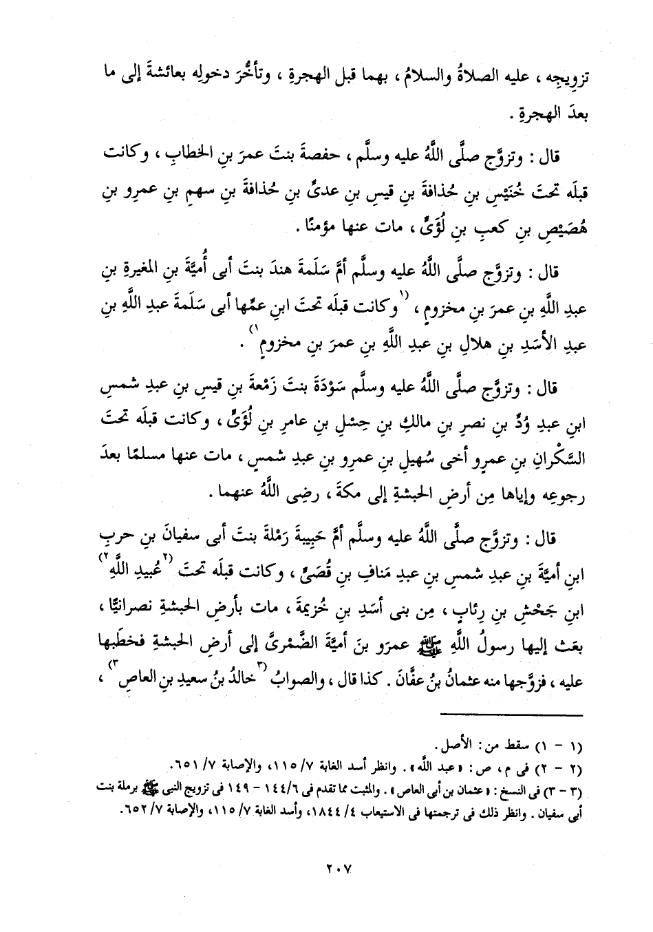 قَالَ: وَتَزَوَّجَ صَلَّى اللَّهُ عَلَيْهِ وَسَلَّمَ، حَفْصَةَ بِنْتَ عُمَرَ بْنِ الْخَطَّابِ، وَكَانَتْ قَبْلَهُ تَحْتَ خُنَيْسِ بْنِ حُذَافَةَ بْنِ قَيْسِ بْنِ عَدِيِّ بْنِ حُذَافَةَ بْنِ سَهْمِ بْنِ عَمْرِو بْنِ هُصَيْصِ بْنِ كَعْبِ بْنِ لُؤَيٍّ مَاتَ عَنْهَا مُؤْمِنًا.