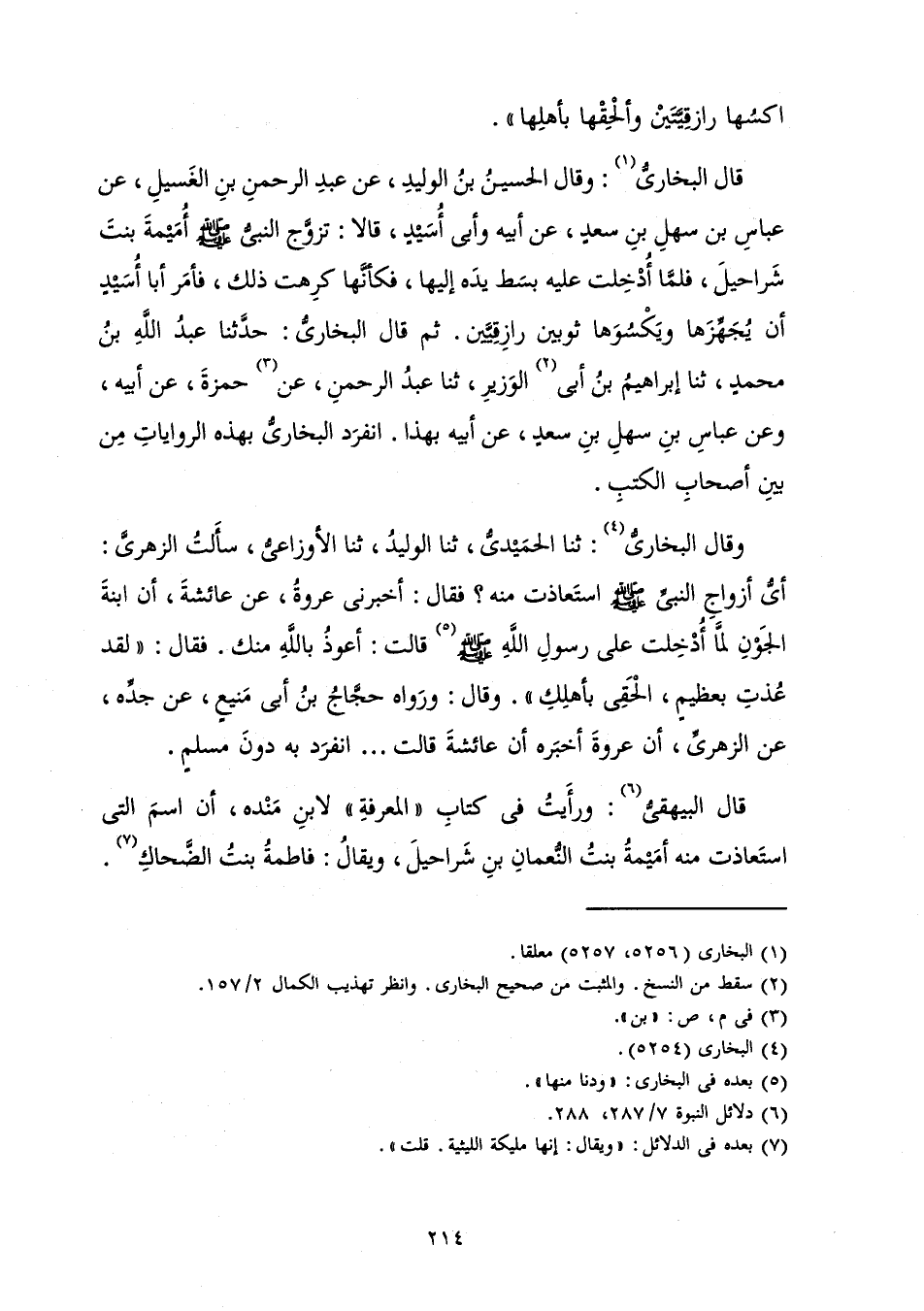 قَالَ الْبُخَارِيُّ: وَقَالَ الْحُسَيْنُ بْنُ الْوَلِيدِ، عَنْ عَبْدِ الرَّحْمَنِ بْنِ الْغَسِيلِ، عَنْ عَبَّاسِ بْنِ سَهْلِ بْنِ سَعْدٍ، عَنْ أَبِيهِ وَأَبِي أُسَيْدٍ، قَالَا: «تَزَوَّجَ النَّبِيُّ صَلَّى اللَّهُ عَلَيْهِ وَسَلَّمَ أُمَيْمَةَ بِنْتَ شَرَاحِيلَ، فَلَمَّا أُدْخِلَتْ عَلَيْهِ بَسَطَ يَدَهُ إِلَيْهَا، فَكَأَنَّهَا كَرِهَتْ ذَلِكَ، فَأَمَرَ أَبَا أُسَيْدٍ أَنْ يُجَهِّزَهَا وَيَكْسُوَهَا ثَوْبَيْنِ رَازِقِيَّيْنِ» . ثُمَّ قَالَ الْبُخَارِيُّ: حَدَّثَنَا عَبْدُ اللَّهِ بْنُ مُحَمَّدٍ، ثَنَا إِبْرَاهِيمُ بْنُ أَبِي الْوَزِيرِ، ثَنَا عَبْدُ الرَّحْمَنِ، عَنْ حَمْزَةَ، عَنْ أَبِيهِ، وَعَنْ عَبَّاسِ بْنِ سَهْلِ بْنِ سَعْدٍ، عَنْ أَبِيهِ بِهَذَا. انْفَرَدَ الْبُخَارِيُّ بِهَذِهِ الرِّوَايَاتِ مِنْ بَيْنِ أَصْحَابِ الْكُتُبِ.