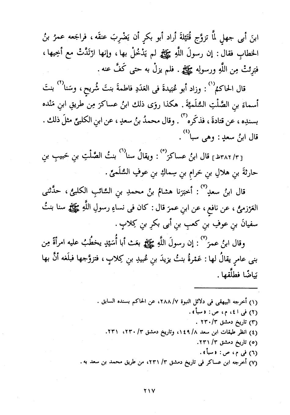 قَالَ الْحَاكِمُ: وَزَادَ أَبُو عُبَيْدَةَ فِي الْعَدَدِ فَاطِمَةَ بِنْتَ شُرَيْحٍ، وَسَنَا بِنْتَ أَسْمَاءَ بْنِ الصَّلْتِ السُّلَمِيَّةُ. هَكَذَا رَوَى ذَلِكَ ابْنُ عَسَاكِرَ مِنْ طَرِيقِ ابْنِ مَنْدَهْ بِسَنَدِهِ، عَنْ قَتَادَةَ، فَذَكَرَهُ. وَقَالَ مُحَمَّدُ بْنُ سَعْدٍ، عَنِ ابْنِ الْكَلْبِيِّ مِثْلَ ذَلِكَ. قَالَ ابْنُ سَعْدٍ: وَهِيَ سَبَا.