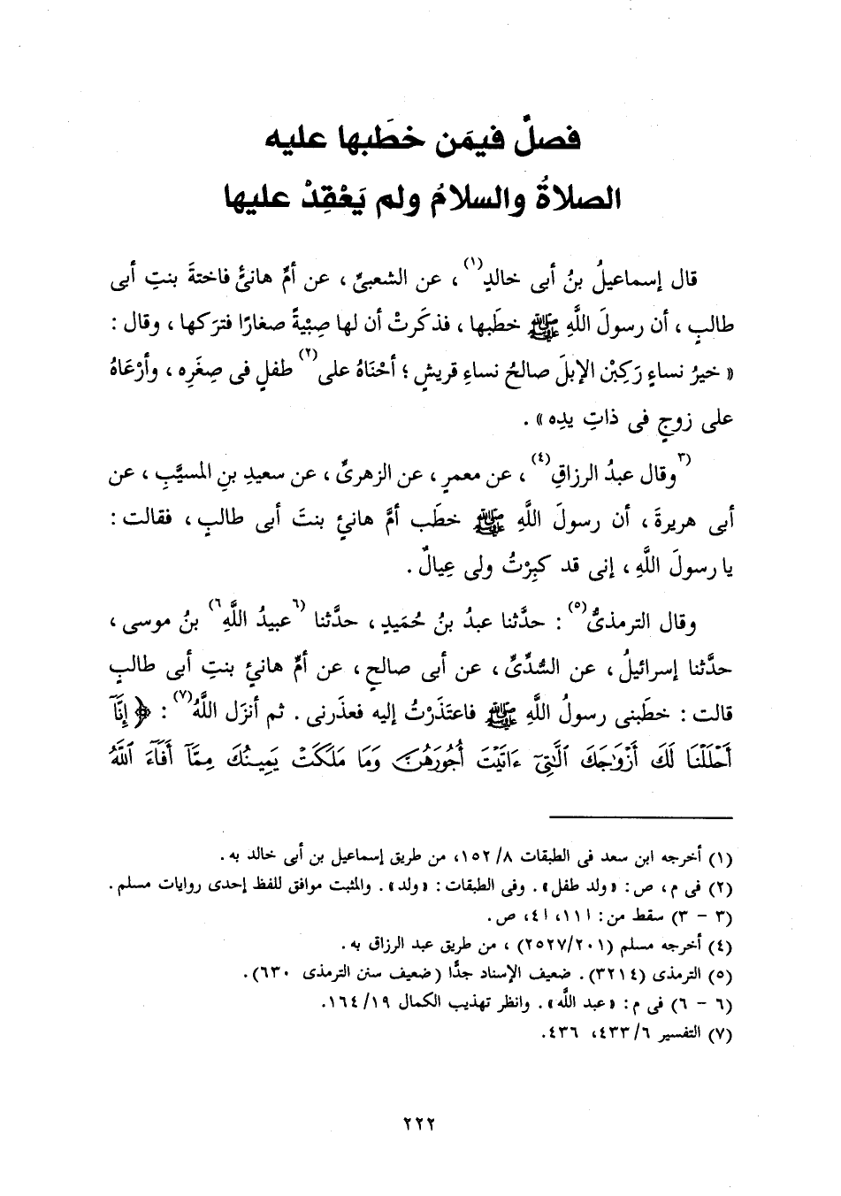 قَالَ إِسْمَاعِيلُ بْنُ أَبِي خَالِدٍ، عَنِ الشَّعْبِيِّ، عَنْ أُمِّ هَانِئٍ فَاخِتَةَ بِنْتِ أَبِي طَالِبٍ أَنَّ رَسُولَ اللَّهِ صَلَّى اللَّهُ عَلَيْهِ وَسَلَّمَ خَطَبَهَا، فَذَكَرَتْ أَنَّ لَهَا صِبْيَةً صِغَارًا فَتَرَكَهَا، وَقَالَ: «خَيْرُ نِسَاءٍ رَكِبْنَ الْإِبِلَ صَالِحُ نِسَاءِ قُرَيْشٍ ; أَحْنَاهُ عَلَى طِفْلٍ فِي صِغَرِهِ، وَأَرْعَاهُ عَلَى زَوْجٍ فِي ذَاتِ يَدِهِ» .