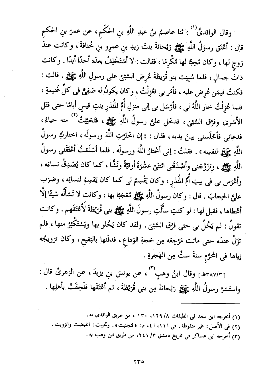 وَقَالَ الْوَاقِدِيُّ: ثَنَا عَاصِمُ بْنُ عَبْدِ اللَّهِ بْنِ الْحَكَمِ، عَنْ عُمَرَ بْنِ الْحَكَمِ قَالَ: «أَعْتَقَ رَسُولُ اللَّهِ صَلَّى اللَّهُ عَلَيْهِ وَسَلَّمَ رَيْحَانَةَ بِنْتَ زَيْدِ بْنِ عَمْرِو بْنِ خُنَافَةَ، وَكَانَتْ عِنْدَ زَوْجٍ لَهَا، وَكَانَ مُحِبًّا لَهَا مُكْرِمًا فَقَالَتْ: لَا أَسْتَخْلِفُ بَعْدَهُ أَحَدًا أَبَدًا. وَكَانَتْ ذَاتَ جَمَالٍ فَلَمَّا سُبِيَتْ بَنُو قُرَيْظَةَ عُرِضَ السَّبْيُ عَلَى رَسُولِ اللَّهِ صَلَّى اللَّهُ عَلَيْهِ وَسَلَّمَ. قَالَتْ: فَكُنْتُ فِيمَنْ عُرِضَ عَلَيْهِ، فَأَمَرَ بِي فَعُزِلْتُ، وَكَانَ يَكُونُ لَهُ صَفِيٌّ فِي كُلِّ غَنِيمَةٍ، فَلَمَّا عُزِلْتُ خَارَ اللَّهَ لِي، فَأَرْسَلَ بِي إِلَى مَنْزِلِ أُمِّ الْمُنْذِرِ بِنْتِ قَيْسٍ أَيَّامًا حَتَّى قَتَلَ الْأَسْرَى وَفَرَّقَ السَّبْيَ، فَدَخَلَ عَلَيَّ رَسُولُ اللَّهِ صَلَّى اللَّهُ عَلَيْهِ وَسَلَّمَ فَتَحَيَّيْتُ مِنْهُ حَيَاءً، فَدَعَانِي فَأَجْلَسَنِي بَيْنَ يَدَيْهِ، فَقَالَ: " إِنِ اخْتَرْتِ اللَّهَ وَرَسُولَهُ اخْتَارَكِ رَسُولُ اللَّهِ صَلَّى اللَّهُ عَلَيْهِ وَسَلَّمَ لِنَفْسِهِ " فَقَلْتُ إِنِّي أَخْتَارُ اللَّهَ وَرَسُولَهُ. فَلَمَّا أَسْلَمْتُ أَعْتَقَنِي رَسُولُ اللَّهِ صَلَّى اللَّهُ عَلَيْهِ وَسَلَّمَ، وَتَزَوَّجَنِي، وَأَصْدَقَنِي اثْنَتَيْ عَشْرَةَ أُوقِيَّةً وَنَشًّا، كَمَا كَانَ يُصْدِقُ نِسَاءَهُ، وَأَعْرَسَ بِي فِي بَيْتِ أُمِّ الْمُنْذِرِ، وَكَانَ يَقْسِمُ لِي كَمَا يَقْسِمُ لِنِسَائِهِ، وَضَرَبَ عَلَيَّ الْحِجَابَ. قَالَ: وَكَانَ رَسُولُ اللَّهِ صَلَّى اللَّهُ عَلَيْهِ وَسَلَّمَ مُعْجَبًا بِهَا، وَكَانَتْ لَا تَسْأَلُهُ شَيْئًا إِلَّا أَعْطَاهَا فَقِيلَ لَهَا: لَوْ كُنْتِ سَأَلْتِ رَسُولَ اللَّهِ صَلَّى اللَّهُ عَلَيْهِ وَسَلَّمَ بَنِي قُرَيْظَةَ لَأَعْتَقَهُمْ. وَكَانَتْ تَقُولُ: لَمْ يَخْلُ بِي حَتَّى فَرَّقَ السَّبْيَ. وَلَقَدْ كَانَ يَخْلُو بِهَا وَيَسْتَكْثِرُ مِنْهَا، فَلَمْ تَزَلْ عِنْدَهُ حَتَّى مَاتَتْ مَرْجِعَهُ مِنْ حَجَّةِ الْوَدَاعِ، فَدَفَنَهَا بِالْبَقِيعِ، وَكَانَ تَزْوِيجُهُ إِيَّاهَا فِي الْمُحَرَّمِ سَنَةَ سِتٍّ مِنَ الْهِجْرَةِ.»