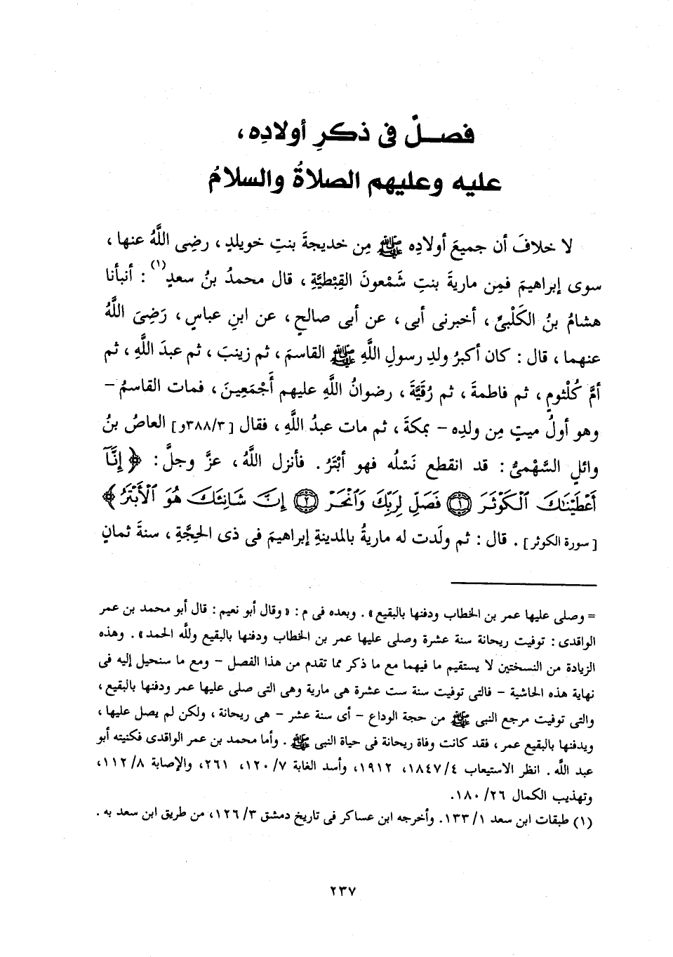 [سُورَةِ الْكَوْثَرِ] قَالَ: ثُمَّ وَلَدَتْ لَهُ مَارِيَةُ بِالْمَدِينَةِ إِبْرَاهِيمَ فِي ذِي الْحِجَّةِ، سَنَةَ ثَمَانٍ