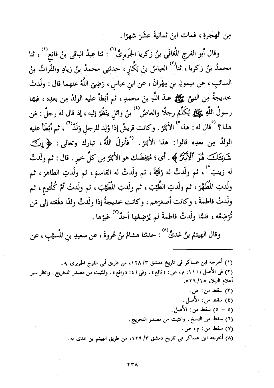وَقَالَ أَبُو الْفَرَجِ الْمُعَافَى بْنُ زَكَرِيَّا الْجَرِيرِيُّ: ثَنَا عَبْدُ الْبَاقِي بْنُ قَانِعٍ، ثَنَا مُحَمَّدُ بْنُ زَكَرِيَّا، ثَنَا الْعَبَّاسُ بْنُ بَكَّارٍ، حَدَّثَنِي مُحَمَّدُ بْنُ زِيَادٍ وَالْفُرَاتُ بْنُ السَّائِبِ، عَنْ مَيْمُونِ بْنِ مِهْرَانَ عَنِ ابْنِ عَبَّاسٍ، رَضِيَ اللَّهُ عَنْهُمَا قَالَ: «وَلَدَتْ خَدِيجَةُ مِنَ النَّبِيِّ صَلَّى اللَّهُ عَلَيْهِ وَسَلَّمَ عَبْدَ اللَّهِ بْنَ مُحَمَّدٍ، ثُمَّ أَبْطَأَ عَلَيْهِ الْوَلَدُ مِنْ بَعْدِهِ، فَبَيْنَا رَسُولُ اللَّهِ يُكَلِّمُ رَجُلًا وَالْعَاصُ بْنُ وَائِلٍ يَنْظُرُ إِلَيْهِ إِذْ قَالَ لَهُ رَجُلٌ: مَنْ هَذَا؟ قَالَ لَهُ: هَذَا الْأَبْتَرُ. وَكَانَتْ قُرَيْشٌ إِذَا وُلِدَ لِلرَّجُلِ وَلَدٌ، ثُمَّ أَبْطَأَ عَلَيْهِ الْوَلَدُ مِنْ بَعْدِهِ قَالُوا: هَذَا الْأَبْتَرُ. فَأَنْزَلَ اللَّهُ، تَبَارَكَ تَعَالَى: {إِنَّ شَانِئَكَ هُوَ الْأَبْتَرُ} [الكوثر: 3] أَيْ ; مُبْغِضُكَ هُوَ الْأَبْتَرُ مِنْ كُلِّ خَيْرٍ. قَالَ: ثُمَّ وَلَدَتْ لَهُ زَيْنَبَ، ثُمَّ وَلَدَتْ لَهُ رُقَيَّةَ، ثُمَّ وَلَدَتْ لَهُ الْقَاسِمَ، ثُمَّ وَلَدَتِ الطَّاهِرَ، ثُمَّ وَلَدَتِ الْمُطَهَّرَ، ثُمَّ وَلَدَتِ الطَّيِّبَ، ثُمَّ وَلَدَتِ الْمُطَيَّبَ، ثُمَّ وَلَدَتْ أُمَّ كُلْثُومٍ، ثُمَّ وَلَدَتْ فَاطِمَةَ، وَكَانَتْ أَصْغَرَهُمْ، وَكَانَتْ خَدِيجَةُ إِذَا وَلَدَتْ وَلَدًا دَفَعَتْهُ إِلَى مَنْ تُرْضِعُهُ، فَلَمَّا وَلَدَتْ فَاطِمَةَ لَمْ يُرْضِعْهَا أَحَدٌ غَيْرُهَا.»