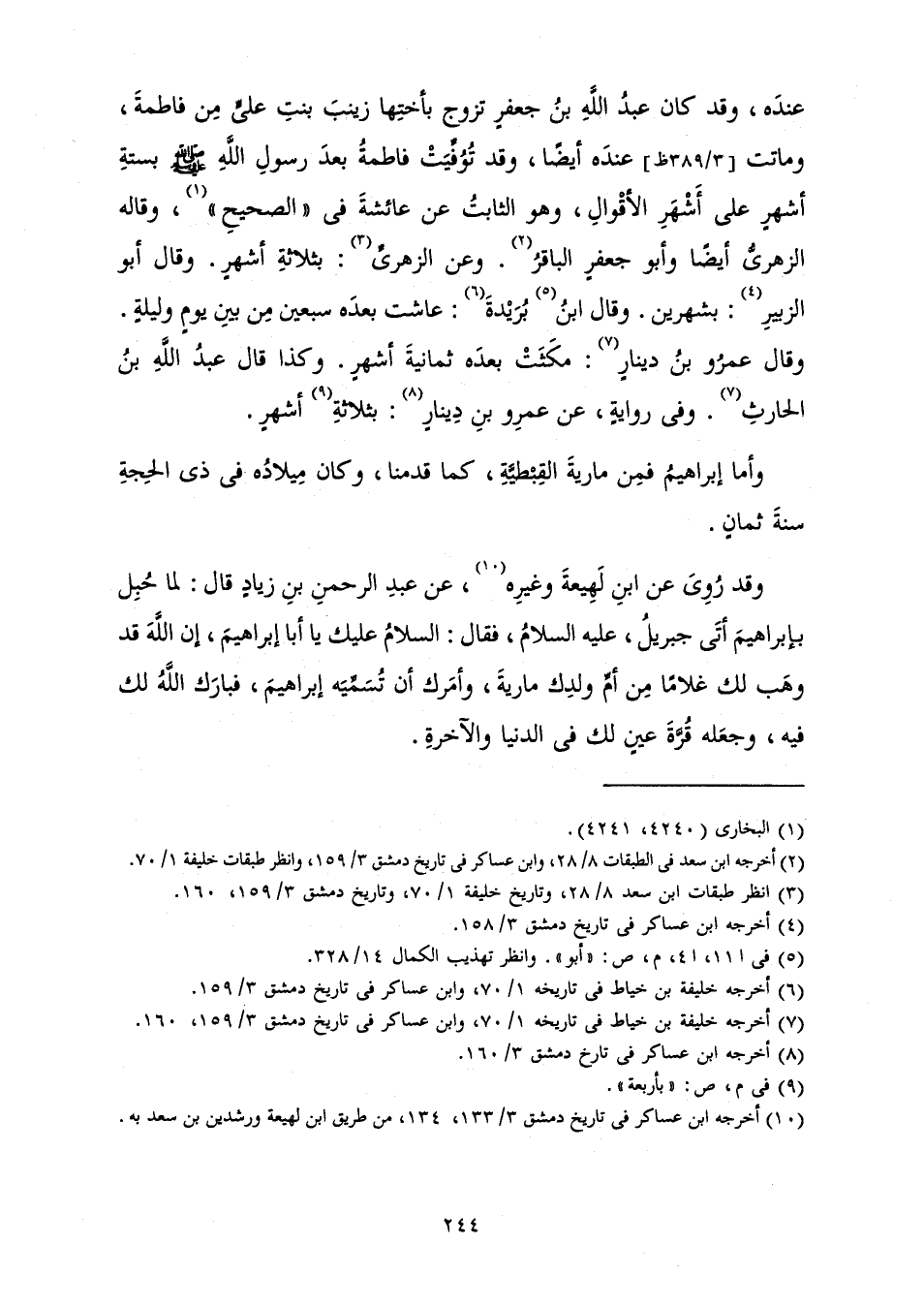 وَأَمَّا إِبْرَاهِيمُ فَمِنْ مَارِيَةَ الْقِبْطِيَّةِ كَمَا قَدَّمْنَا، وَكَانَ مِيلَادُهُ فِي ذِي الْحِجَّةِ سَنَةَ ثَمَانٍ.