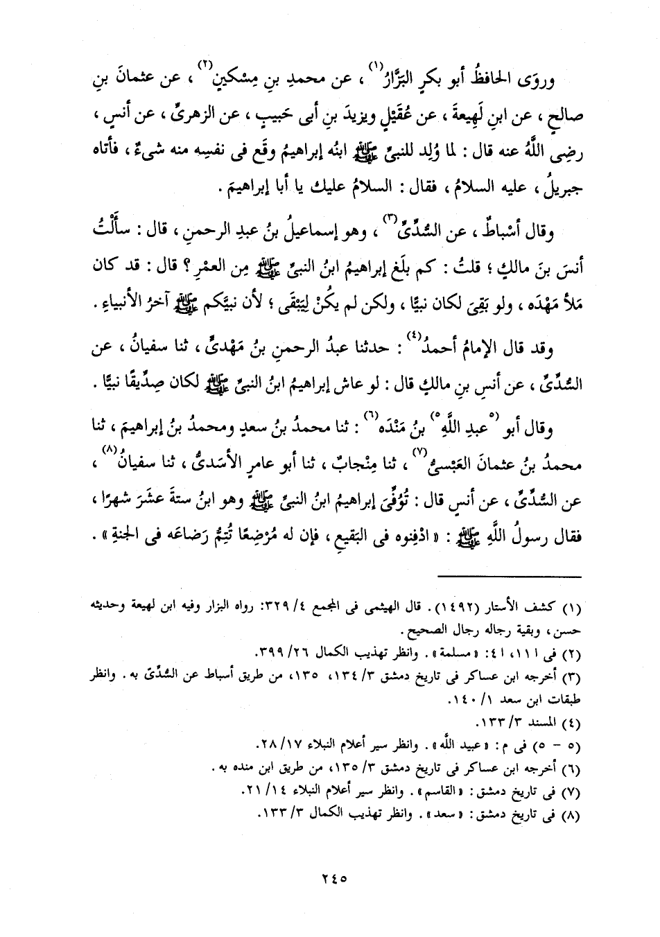 وَقَالَ أَبُو عَبْدِ اللَّهِ بْنُ مَنْدَهْ: ثَنَا مُحَمَّدُ بْنُ سَعْدٍ وَمُحَمَّدُ بْنُ إِبْرَاهِيمَ، ثَنَا مُحَمَّدُ بْنُ عُثْمَانَ الْعَبْسِيُّ، ثَنَا مِنْجَابٌ، ثَنَا أَبُو عَامِرٍ الْأَسَدِيُّ، ثَنَا سُفْيَانُ، عَنِ السُّدِّيِّ، عَنْ أَنَسٍ قَالَ: «تُوُفِّيَ إِبْرَاهِيمُ ابْنُ النَّبِيِّ صَلَّى اللَّهُ عَلَيْهِ وَسَلَّمَ، وَهُوَ ابْنُ سِتَّةَ عَشَرَ شَهْرًا، فَقَالَ رَسُولُ اللَّهِ صَلَّى اللَّهُ عَلَيْهِ وَسَلَّمَ " ادْفِنُوهُ فِي الْبَقِيعِ، فَإِنَّ لَهُ مُرْضِعًا تُتِمُّ رَضَاعَهُ فِي الْجَنَّةِ» ".