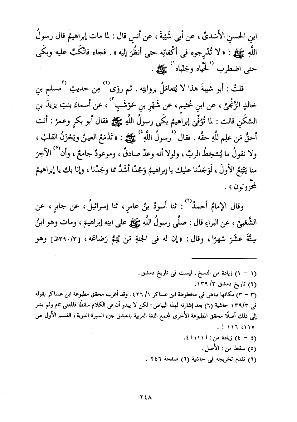 بْنِ الْحَسَنِ الْأَسَدِيِّ، عَنْ أَبِي شَيْبَةَ، عَنْ أَنَسٍ قَالَ: لَمَّا مَاتَ إِبْرَاهِيمُ قَالَ رَسُولُ اللَّهِ صَلَّى اللَّهُ عَلَيْهِ وَسَلَّمَ «: " لَا تُدْرِجُوهُ فِي أَكْفَانِهِ حَتَّى أَنْظُرَ إِلَيْهِ " فَجَاءَ فَانْكَبَّ عَلَيْهِ وَبَكَى حَتَّى اضْطَرَبَ لِحْيَاهُ وَجَنْبَاهُ صَلَّى اللَّهُ عَلَيْهِ وَسَلَّمَ» .