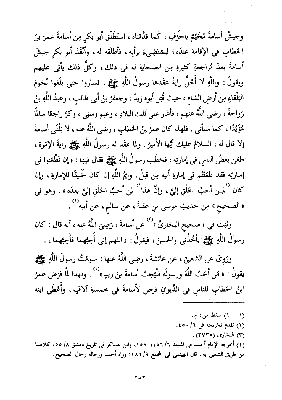 وَجَيْشُ أُسَامَةَ مُخَيَّمٌ بِالْجُرْفِ، كَمَا قَدَّمْنَاهُ، اسْتَطْلَقَ أَبُو بَكْرٍ مِنْ أُسَامَةَ عُمَرَ بْنَ الْخَطَّابِ فِي الْإِقَامَةِ عِنْدَهُ ; لِيَسْتَضِيءَ بِرَأْيِهِ، فَأَطْلَقَهُ لَهُ، وَأَنْفَذَ أَبُو بَكْرٍ جَيْشَ أُسَامَةَ بَعْدَ مُرَاجَعَةٍ كَثِيرَةٍ مِنَ الصَّحَابَةِ لَهُ فِي ذَلِكَ، وَكُلُّ ذَلِكَ يَأْبَى عَلَيْهِمْ وَيَقُولُ: وَاللَّهِ لَا أَحُلُّ رَايَةً عَقَدَهَا رَسُولُ اللَّهِ صَلَّى اللَّهُ عَلَيْهِ وَسَلَّمَ. فَسَارُوا حَتَّى بَلَغُوا تُخُومَ الْبَلْقَاءِ مِنْ أَرْضِ الشَّامِ حَيْثُ قُتِلَ أَبُوهُ زَيْدٌ، وَجَعْفَرُ بْنُ أَبِي طَالِبٍ، وَعَبْدُ اللَّهِ بْنُ رَوَاحَةَ رَضِيَ اللَّهُ عَنْهُمْ، فَأَغَارَ عَلَى تِلْكَ الْبِلَادِ، وَغَنِمَ وَسَبَى، وَكَرَّ رَاجِعًا سَالِمًا مُؤَيَّدًا، كَمَا سَيَأْتِي. فَلِهَذَا كَانَ عُمَرُ بْنُ الْخَطَّابِ رَضِيَ اللَّهُ عَنْهُ، لَا يَلْقَى أُسَامَةَ إِلَّا قَالَ لَهُ: السَّلَامُ عَلَيْكَ أَيُّهَا الْأَمِيرُ. وَلَمَّا عَقَدَ لَهُ رَسُولُ اللَّهِ صَلَّى اللَّهُ عَلَيْهِ وَسَلَّمَ رَايَةَ الْإِمْرَةِ، طَعَنَ بَعْضُ النَّاسِ فِي إِمَارَتِهِ فَخَطَبَ رَسُولُ اللَّهِ صَلَّى اللَّهُ عَلَيْهِ وَسَلَّمَ فَقَالَ فِيهَا «: " إِنْ تَطْعَنُوا فِي إِمَارَتِهِ فَقَدْ طَعَنْتُمْ فِي إِمَارَةِ أَبِيهِ مِنْ قَبْلُ، وَايْمُ اللَّهِ إِنْ كَانَ لَخَلِيقًا لِلْإِمَارَةِ، وَإِنْ كَانَ لَمِنْ أَحَبِّ الْخَلْقِ إِلَيَّ، وَإِنَّ هَذَا لَمِنْ أَحَبِّ الْخَلْقِ إِلَيَّ بَعْدَهُ» وَهُوَ فِي " الصَّحِيحِ " مِنْ حَدِيثِ مُوسَى بْنِ عُقْبَةَ عَنْ سَالِمٍ عَنْ أَبِيهِ.