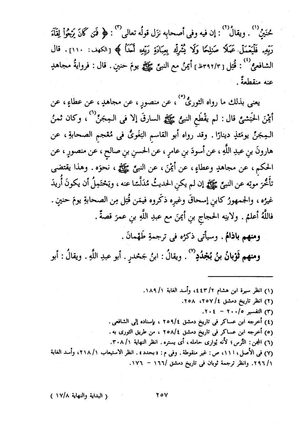 يَعْنِي بِذَلِكَ مَا رَوَاهُ الثَّوْرِيُّ، عَنْ مَنْصُورٍ، عَنْ مُجَاهِدٍ، عَنْ عَطَاءٍ، عَنْ أَيْمَنَ الْحَبَشِيِّ قَالَ: «لَمْ يَقْطَعِ النَّبِيُّ صَلَّى اللَّهُ عَلَيْهِ وَسَلَّمَ السَّارِقَ إِلَّا فِي الْمِجَنِّ، وَكَانَ ثَمَنُ الْمِجَنِّ يَوْمَئِذٍ دِينَارًا» . وَقَدْ رَوَاهُ أَبُو الْقَاسِمِ الْبَغَوِيُّ فِي مُعْجَمِ الصَّحَابَةِ، عَنْ هَارُونَ بْنِ عَبْدِ اللَّهِ، عَنْ أَسْوَدَ بْنِ عَامِرٍ، عَنِ الْحَسَنِ بْنِ صَالِحٍ، عَنْ مَنْصُورٍ، عَنِ الْحَكَمِ، عَنْ مُجَاهِدٍ وَعَطَاءٍ، عَنْ أَيْمَنَ عَنِ النَّبِيِّ صَلَّى اللَّهُ عَلَيْهِ وَسَلَّمَ، نَحْوَهُ. وَهَذَا يَقْتَضِي تَأَخُّرَ مَوْتِهِ عَنِ النَّبِيِّ صَلَّى اللَّهُ عَلَيْهِ وَسَلَّمَ إِنْ لَمْ يَكُنِ الْحَدِيثُ مُدَلَّسًا عَنْهُ، وَيَحْتَمِلُ أَنْ يَكُونَ أُرِيدَ غَيْرُهُ، وَالْجُمْهُورُ كَابْنِ إِسْحَاقَ وَغَيْرِهِ ذَكَرُوهُ فِيمَنْ قُتِلَ مِنَ الصَّحَابَةِ يَوْمَ حُنَيْنٍ. فَاللَّهُ أَعْلَمُ. وَلِابْنِهِ الْحَجَّاجِ بْنِ أَيْمَنَ مَعَ عَبْدِ اللَّهِ بْنِ عُمَرَ قِصَّةٌ.