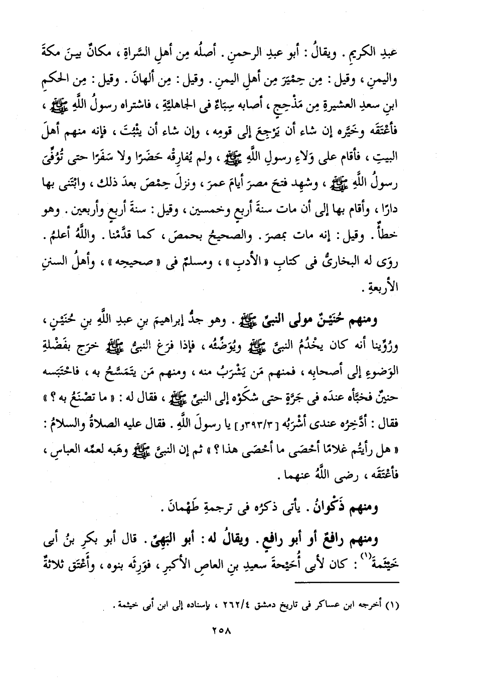 وَمِنْهُمْ حُنَيْنٌ مَوْلَى النَّبِيِّ صَلَّى اللَّهُ عَلَيْهِ وَسَلَّمَ. وَهُوَ جَدُّ إِبْرَاهِيمَ بْنِ عَبْدِ اللَّهِ بْنِ حُنَيْنٍ وَرُوِّينَا «أَنَّهُ كَانَ يَخْدُمُ النَّبِيَّ صَلَّى اللَّهُ عَلَيْهِ وَسَلَّمَ وَيُوَضِّئُهُ، فَإِذَا فَرَغَ النَّبِيُّ صَلَّى اللَّهُ عَلَيْهِ وَسَلَّمَ خَرَجَ بِفَضْلَةِ الْوَضُوءِ إِلَى أَصْحَابِهِ، فَمِنْهُمْ مَنْ يَشْرَبُ مِنْهُ، وَمِنْهُمْ مَنْ يَتَمَسَّحُ بِهِ، فَاحْتَبَسَهُ حُنَيْنٌ فَخَبَّأَهُ عِنْدَهُ فِي جَرَّةٍ حَتَّى شَكَوْهُ إِلَى النَّبِيِّ صَلَّى اللَّهُ عَلَيْهِ وَسَلَّمَ، فَقَالَ لَهُ: " مَا تَصَنَعُ بِهِ؟ " فَقَالَ: أَدَّخِرُهُ عِنْدِي أَشْرَبُهُ يَا رَسُولَ اللَّهِ. فَقَالَ عَلَيْهِ الصَّلَاةُ وَالسَّلَامُ: " هَلْ رَأَيْتُمْ غُلَامًا أَحْصَى مَا أَحْصَى هَذَا؟ " ثُمَّ إِنَّ النَّبِيَّ صَلَّى اللَّهُ عَلَيْهِ وَسَلَّمَ، وَهَبَهُ لِعَمِّهِ الْعَبَّاسِ، فَأَعْتَقَهُ، رَضِيَ اللَّهُ عَنْهُمَا» .