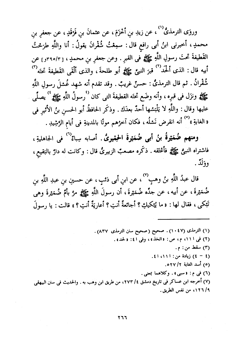 وَرَوَى التِّرْمِذِيُّ، عَنْ زَيْدِ بْنِ أَخْزَمَ، عَنْ عُثْمَانَ بْنِ فَرَقَدٍ، عَنْ جَعْفَرِ بْنِ مُحَمَّدٍ، أَخْبَرَنِي ابْنُ أَبِي رَافِعٍ قَالَ: سَمِعْتُ شُقْرَانَ يَقُولُ: أَنَا وَاللَّهِ طَرَحْتُ الْقَطِيفَةَ تَحْتَ رَسُولِ اللَّهِ صَلَّى اللَّهُ عَلَيْهِ وَسَلَّمَ فِي الْقَبْرِ. وَعَنْ جَعْفَرِ بْنِ مُحَمَّدٍ، عَنْ أَبِيهِ قَالَ: الَّذِي أَلْحَدَ قَبْرَ النَّبِيِّ صَلَّى اللَّهُ عَلَيْهِ وَسَلَّمَ أَبُو طَلْحَةَ، وَالَّذِي أَلْقَى الْقَطِيفَةَ تَحْتَهُ شُقْرَانُ. ثُمَّ قَالَ التِّرْمِذِيُّ: حَسَنٌ غَرِيبٌ. وَقَدْ تَقَدَّمَ أَنَّهُ شَهِدَ غُسْلَ رَسُولِ اللَّهِ صَلَّى اللَّهُ عَلَيْهِ وَسَلَّمَ، وَنَزَلَ فِي قَبْرِهِ، وَأَنَّهُ وَضَعَ تَحْتَهُ الْقَطِيفَةَ الَّتِي كَانَ رَسُولُ اللَّهِ صَلَّى اللَّهُ عَلَيْهِ وَسَلَّمَ يُصَلِّي عَلَيْهَا وَقَالَ: وَاللَّهِ لَا يَلْبَسُهَا أَحَدٌ بَعْدَكَ. وَذَكَرَ الْحَافِظُ أَبُو الْحَسَنِ بْنُ الْأَثِيرِ فِي " الْغَابَةِ " أَنَّهُ انْقَرَضَ نَسْلُهُ، فَكَانَ آخِرُهُمْ مَوْتًا بِالْمَدِينَةِ فِي أَيَّامِ الرَّشِيدِ.