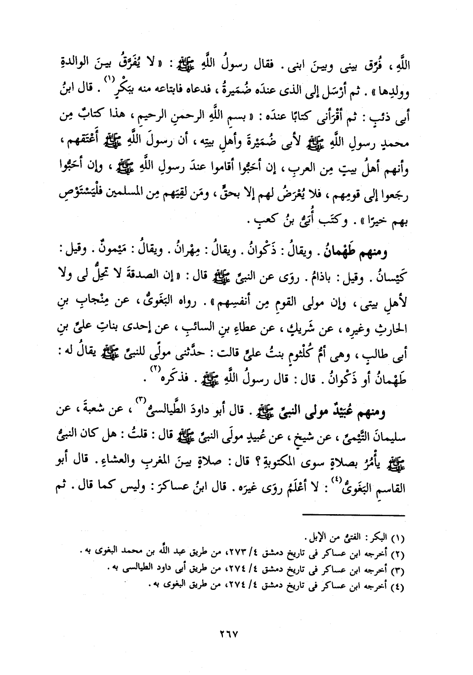 وَمِنْهُمْ طَهْمَانُ. وَيُقَالُ: ذَكْوَانُ. وَيُقَالُ: مِهْرَانُ. وَيُقَالُ: مَيْمُونٌ. وَقِيلَ: كَيْسَانُ. وَقِيلَ: بَاذَامُ. رَوَى عَنِ النَّبِيِّ صَلَّى اللَّهُ عَلَيْهِ وَسَلَّمَ قَالَ: «إِنَّ الصَّدَقَةَ لَا تَحِلُّ لِي وَلَا لِأَهْلِ بَيْتِي، وَإِنَّ مَوْلَى الْقَوْمِ مِنْ أَنْفُسِهِمْ» رَوَاهُ الْبَغْوِيُّ، عَنْ مِنْجَابِ بْنِ الْحَارِثِ وَغَيْرِهِ، عَنْ شَرِيكٍ، عَنْ عَطَاءِ بْنِ السَّائِبِ، عَنْ إِحْدَى بَنَاتِ عَلِيِّ بْنِ أَبِي طَالِبٍ، وَهِيَ أُمُّ كُلْثُومٍ بِنْتُ عَلِيٍّ قَالَتْ: حَدَّثَنِي مَوْلًى لِلنَّبِيِّ صَلَّى اللَّهُ عَلَيْهِ وَسَلَّمَ يُقَالُ لَهُ: طَهْمَانُ أَوْ ذَكْوَانُ. قَالَ: قَالَ رَسُولُ اللَّهِ صَلَّى اللَّهُ عَلَيْهِ وَسَلَّمَ. فَذَكَرَهُ.