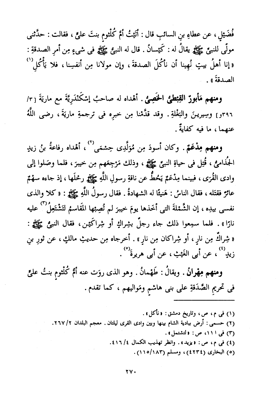 فُضَيْلٍ، عَنْ عَطَاءِ بْنِ السَّائِبِ قَالَ: «أَتَيْتُ أُمَّ كُلْثُومٍ بِنْتَ عَلِيٍّ فَقَالَتْ: حَدَّثَنِي مَوْلًى لِلنَّبِيِّ صَلَّى اللَّهُ عَلَيْهِ وَسَلَّمَ يُقَالُ لَهُ: كَيْسَانُ. قَالَ لَهُ النَّبِيُّ صَلَّى اللَّهُ عَلَيْهِ وَسَلَّمَ فِي شَيْءٍ مِنْ أَمْرِ الصَّدَقَةِ: " إِنَّا أَهْلُ بَيْتٍ نُهِينَا أَنْ نَأْكُلَ الصَّدَقَةَ، وَإِنَّ مَوْلَانَا مِنْ أَنْفُسِنَا، فَلَا يَأْكُلُ الصَّدَقَةَ» .