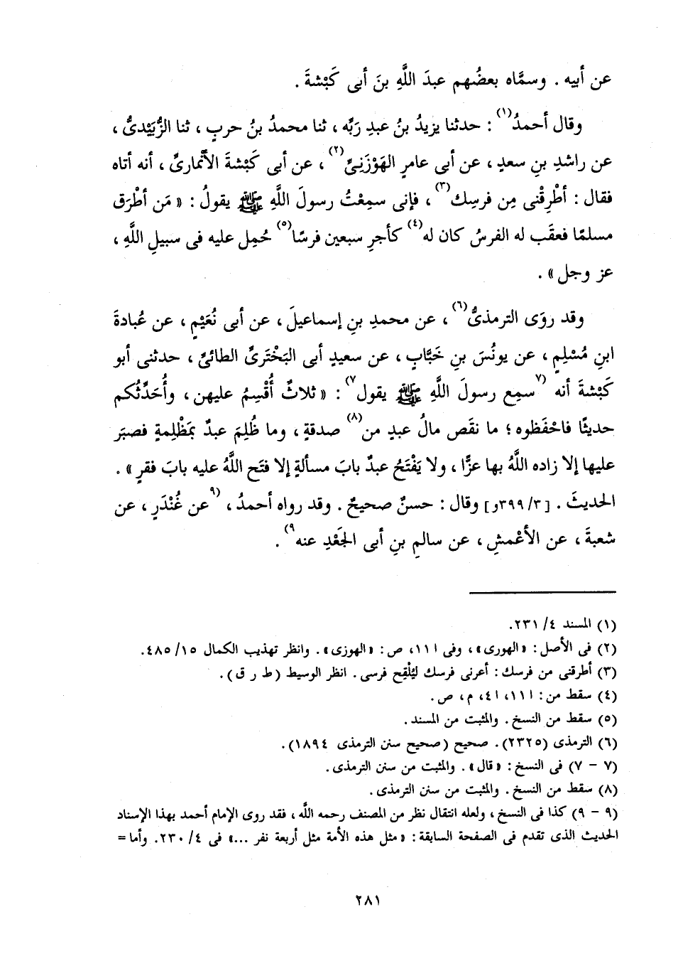وَقَدْ رَوَى التِّرْمِذِيُّ، عَنْ مُحَمَّدِ بْنِ إِسْمَاعِيلَ، عَنْ أَبِي نُعَيْمٍ، عَنْ عُبَادَةَ بْنِ مُسْلِمٍ، عَنْ يُونُسَ بْنِ خَبَّابٍ، عَنْ سَعِيدٍ أَبِي الْبَخْتَرِيِّ الطَّائِيِّ، حَدَّثَنِي أَبُو كَبْشَةَ أَنَّهُ سَمِعَ رَسُولَ اللَّهِ صَلَّى اللَّهُ عَلَيْهِ وَسَلَّمَ يَقُولُ: «ثَلَاثٌ أُقْسِمُ عَلَيْهِنَّ، وَأُحَدِّثُكُمْ حَدِيثًا فَاحْفَظُوهُ ; مَا نَقَصَ مَالُ عَبْدٍ مِنْ صَدَقَةٍ، وَمَا ظُلِمَ عَبْدٌ بِمَظْلِمَةٍ فَصَبَرَ عَلَيْهَا إِلَّا زَادَهُ اللَّهُ بِهَا عِزًّا، وَلَا يَفْتَحُ عَبْدٌ بَابَ مَسْأَلَةٍ إِلَّا فَتَحَ اللَّهُ عَلَيْهِ بَابَ فَقْرٍ» الْحَدِيثَ. وَقَالَ: حَسَنٌ صَحِيحٌ. وَقَدْ رَوَاهُ أَحْمَدُ، عَنْ غُنْدَرٍ، عَنْ شُعْبَةَ، عَنِ الْأَعْمَشِ، عَنْ سَالِمِ بْنِ أَبِي الْجَعْدِ عَنْهُ.