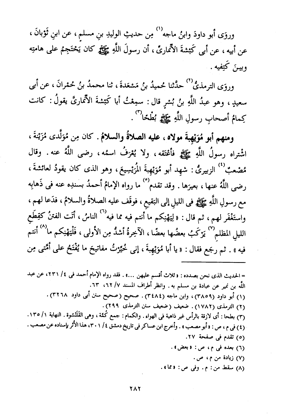 وَمِنْهُمْ أَبُو مُوَيْهِبَةَ مَوْلَاهُ، عَلَيْهِ الصَّلَاةُ وَالسَّلَامُ. وَكَانَ مِنْ مُوَلَّدِي مُزَيْنَةَ، اشْتَرَاهُ رَسُولُ اللَّهِ صَلَّى اللَّهُ عَلَيْهِ وَسَلَّمَ فَأَعْتَقَهُ، وَلَا يُعْرَفُ اسْمَهُ رَضِيَ اللَّهُ عَنْهُ. وَقَالَ مُصْعَبٌ الزُّبَيْرِيُّ شَهِدَ أَبُو مُوَيْهِبَةَ الْمُرَيْسِيعَ وَهُوَ الَّذِي كَانَ يَقُودُ لِعَائِشَةَ، رَضِيَ اللَّهُ عَنْهَا، بَعِيرَهَا. وَقَدْ تَقَدَّمَ مَا رَوَاهُ الْإِمَامُ أَحْمَدُ بِسَنَدِهِ عَنْهُ فِي ذَهَابِهِ مَعَ رَسُولِ اللَّهِ صَلَّى اللَّهُ عَلَيْهِ وَسَلَّمَ فِي اللَّيْلِ إِلَى الْبَقِيعِ فَوَقَفَ عَلَيْهِ الصَّلَاةُ وَالسَّلَامُ، فَدَعَا لَهُمْ، وَاسْتَغْفَرَ لَهُمْ، ثُمَّ قَالَ: «لِيَهْنِكُمْ مَا أَنْتُمْ فِيهِ مِمَّا فِيهِ النَّاسُ. أَتَتِ الْفِتَنُ كَقِطَعِ اللَّيْلِ الْمُظْلِمِ يَرْكَبُ بَعْضُهَا بَعْضًا، الْآخِرَةُ أَشَدُّ مِنَ الْأُولَى، فَلْيَهْنِكُمْ مَا أَنْتُمْ فِيهِ» ثُمَّ رَجَعَ فَقَالَ «يَا أَبَا مُوَيْهِبَةَ، إِنِّي خُيِّرْتُ مَفَاتِيحَ مَا يُفْتَحُ عَلَى أُمَّتِي مِنْ