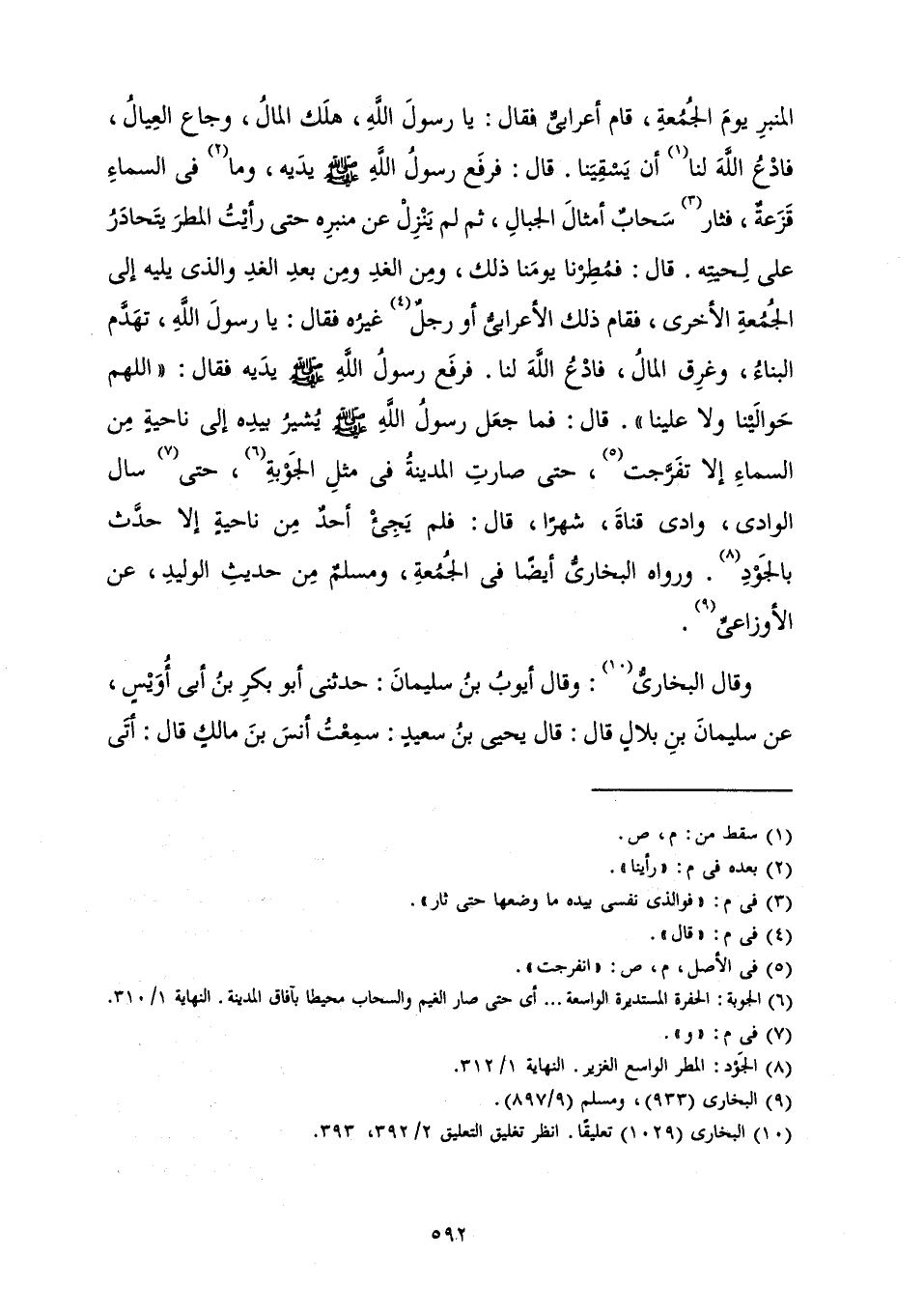 الْمِنْبَرِ يَوْمَ الْجُمُعَةَ فَقَامَ أَعْرَابِيٌّ فَقَالَ: يَا رَسُولَ اللَّهِ هَلَكَ الْمَالُ، وَجَاعَ الْعِيَالُ، فَادْعُ اللَّهَ لَنَا أَنْ يَسْقِيَنَا. قَالَ: فَرَفَعَ رَسُولُ اللَّهِ صَلَّى اللَّهُ عَلَيْهِ وَسَلَّمَ يَدَيْهِ، وَمَا فِي السَّمَاءِ قَزَعَةٌ فَثَارَ سَحَابٌ أَمْثَالَ الْجِبَالِ ثُمَّ لَمْ يَنْزِلْ عَنْ مِنْبَرِهِ حَتَّى رَأَيْتُ الْمَطَرَ يَتَحَادَرُ عَلَى لِحْيَتِهِ. قَالَ: فَمُطِرْنَا يَوْمَنَا ذَلِكَ، وَمِنَ الْغَدِ وَمِنْ بَعْدِ الْغَدِ وَالَّذِي يَلِيهِ إِلَى الْجُمُعَةِ الْأُخْرَى، فَقَامَ ذَلِكَ الْأَعْرَابِيُّ أَوْ رَجُلٌ غَيْرُهُ فَقَالَ: يَا رَسُولَ اللَّهِ، تَهَدَّمَ الْبِنَاءُ، وَغَرِقَ الْمَالُ، فَادْعُ اللَّهَ لَنَا. فَرَفَعَ رَسُولُ اللَّهِ صَلَّى اللَّهُ عَلَيْهِ وَسَلَّمَ يَدَيْهِ فَقَالَ: اللَّهُمَّ حَوَالَيْنَا وَلَا عَلَيْنَا قَالَ: فَمَا جَعَلَ رَسُولُ اللَّهِ صَلَّى اللَّهُ عَلَيْهِ وَسَلَّمَ يُشِيرُ بِيَدِهِ إِلَى نَاحِيَةٍ مِنَ السَّمَاءِ إِلَّا تَفَرَّجَتْ، حَتَّى صَارَتِ الْمَدِينَةُ فِي مِثْلِ الْجَوْبَةِ، حَتَّى سَالَ الْوَادِي، وَادِي قَنَاةَ، شَهْرًا، قَالَ: فَلَمْ يَجِيءْ أَحَدٌ مِنْ نَاحِيَةٍ إِلَّا حَدَّثَ بِالْجُودِ» . وَرَوَاهُ الْبُخَارِيُّ أَيْضًا فِي الْجُمُعَةِ، وَمُسْلِمٌ مِنْ حَدِيثِ الْوَلِيدِ، عَنِ الْأَوْزَاعِيِّ.