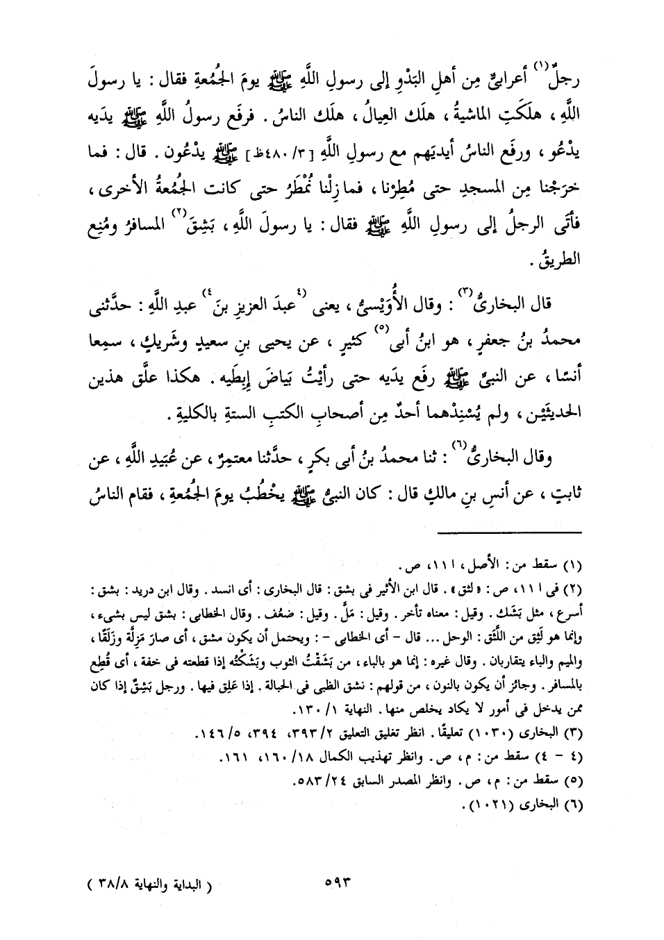 رَجُلٌ أَعْرَابِيٌّ مِنْ أَهْلِ الْبَدْوِ إِلَى رَسُولِ اللَّهِ صَلَّى اللَّهُ عَلَيْهِ وَسَلَّمَ يَوْمَ الْجُمُعَةَ فَقَالَ: يَا رَسُولَ اللَّهِ هَلَكَتِ الْمَاشِيَةُ هَلَكَ الْعِيَالُ هَلَكَ النَّاسُ. فَرَفَعَ رَسُولُ اللَّهِ صَلَّى اللَّهُ عَلَيْهِ وَسَلَّمَ يَدَيْهِ يَدْعُو، وَرَفَعَ النَّاسُ أَيْدِيَهُمْ مَعَ رَسُولِ اللَّهِ صَلَّى اللَّهُ عَلَيْهِ وَسَلَّمَ يَدْعُونَ. قَالَ فَمَا خَرَجْنَا مِنَ الْمَسْجِدِ حَتَّى مُطِرْنَا، فَمَا زِلْنَا نُمْطَرُ حَتَّى كَانَتِ الْجُمُعَةُ الْأُخْرَى، فَأَتَى الرَّجُلُ إِلَى رَسُولِ اللَّهِ صَلَّى اللَّهُ عَلَيْهِ وَسَلَّمَ فَقَالَ: يَا رَسُولَ اللَّهِ بَشِقَ الْمُسَافِرُ وَمُنِعَ الطَّرِيقُ» .