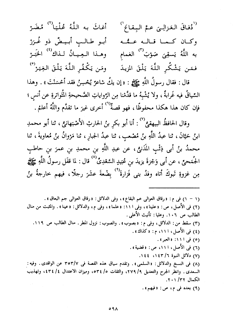 وَقَالَ الْحَافِظُ الْبَيْهَقِيُّ: أَنَا أَبُو بَكْرِ بْنُ الْحَارِثِ الْأَصْبَهَانِيُّ، ثَنَا أَبُو مُحَمَّدِ بْنُ حَيَّانَ، ثَنَا عَبْدُ اللَّهِ بْنُ مُصْعَبٍ، ثَنَا عَبْدُ الْجَبَّارِ، ثَنَا مَرْوَانُ بْنُ مُعَاوِيَةَ، ثَنَا مُحَمَّدُ بْنُ أَبِي ذِئْبٍ الْمَدَنِيُّ، عَنْ عَبْدِ اللَّهِ بْنِ مُحَمَّدِ بْنِ عُمَرَ بْنِ حَاطِبٍ الْجُمَحِيِّ، عَنْ أَبِي وَجْزَةَ يَزِيدَ بْنِ عُبَيْدٍ السَّعْدِيِّ قَالَ: «لَمَّا قَفَلَ رَسُولُ اللَّهِ صَلَّى اللَّهُ عَلَيْهِ وَسَلَّمَ مِنْ غَزْوَةِ تَبُوكَ أَتَاهُ وَفْدُ بَنِي فَزَارَةَ بِضْعَةَ عَشَرَ رَجُلًا، فِيهِمْ خَارِجَةُ بْنُ