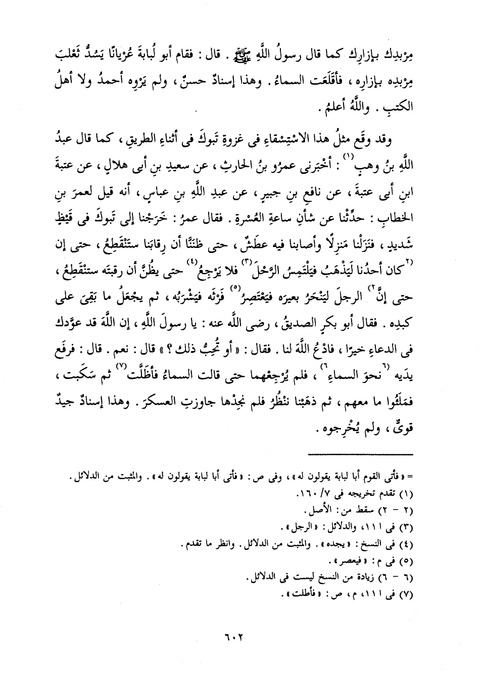 وَقَدْ وَقَعَ مِثْلُ هَذَا الِاسْتِسْقَاءِ فِي غَزْوَةِ تَبُوكَ فِي أَثْنَاءِ الطَّرِيقِ، كَمَا قَالَ عَبْدُ اللَّهِ بْنُ وَهْبٍ: أَخْبَرَنِي عَمْرُو بْنُ الْحَارِثِ، عَنْ سَعِيدِ بْنِ أَبِي هِلَالٍ، عَنْ عُتْبَةَ بْنِ أَبِي عُتْبَةَ، عَنْ نَافِعِ بْنِ جُبَيْرٍ، عَنْ عَبْدِ اللَّهِ بْنِ عَبَّاسٍ، «أَنَّهُ قِيلَ لِعُمَرَ بْنِ الْخَطَّابِ: حَدِّثْنَا عَنْ شَأْنِ سَاعَةِ الْعُسْرَةِ. فَقَالَ عُمَرُ: خَرَجْنَا إِلَى تَبُوكَ فِي قَيْظٍ شَدِيدٍ، فَنَزَلْنَا مَنْزِلًا وَأَصَابَنَا فِيهِ عَطَشٌ، حَتَّى ظَنَنَّا أَنَّ رِقَابَنَا سَتَنْقَطِعُ، حَتَّى إِنْ كَانَ أَحَدُنَا لَيَذْهَبُ فَيَلْتَمِسُ الرَّحْلَ فَلَا يَرْجِعُ حَتَّى يَظُنَّ أَنَّ رَقَبَتَهُ سَتَنْقَطِعُ، حَتَّى إِنِ الرَّجُلَ لَيَنْحَرُ بَعِيرَهُ فَيَعْتَصِرُ فَرْثَهُ فَيَشْرَبُهُ، ثُمَّ يَجْعَلُ مَا بَقِيَ عَلَى كَبِدِهِ. فَقَالَ أَبُو بَكْرٍ الصِّدِّيقٌ رَضِيَ اللَّهُ عَنْهُ، يَا رَسُولَ اللَّهِ، إِنِ اللَّهَ قَدْ عَوَّدَكَ فِي الدُّعَاءِ خَيْرًا، فَادْعُ اللَّهَ لَنَا. فَقَالَ " أَوَتُحِبُّ ذَلِكَ؟ " قَالَ: نَعَمْ. قَالَ: فَرَفَعَ يَدَيْهِ نَحْوَ السَّمَاءِ فَلَمْ يُرْجِعْهُمَا حَتَّى قَالَتِ السَّمَاءُ فَأَظَلَّتْ ثُمَّ سَكَبَتْ، فَمَلَؤُوا مَا مَعَهُمْ، ثُمَّ ذَهَبْنَا نَنْظُرُ فَلَمْ نَجِدْهَا جَاوَزَتِ الْعَسْكَرَ.» وَهَذَا إِسْنَادٌ جَيِّدٌ قَوِيٌّ، وَلَمْ يُخْرِجُوهُ.