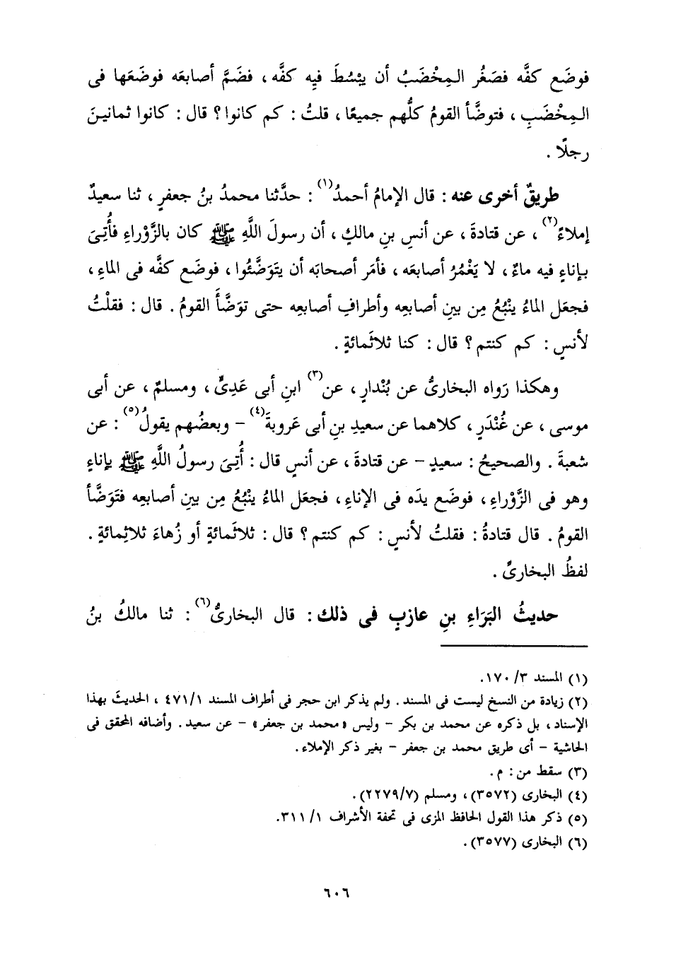 طَرِيقٌ أُخْرَى عَنْهُ: قَالَ الْإِمَامُ أَحْمَدُ: حَدَّثَنَا مُحَمَّدُ بْنُ جَعْفَرٍ، ثَنَا سَعِيدٌ إِمْلَاءً، عَنْ قَتَادَةَ، عَنْ أَنَسِ بْنِ مَالِكٍ، «أَنَّ رَسُولَ اللَّهِ صَلَّى اللَّهُ عَلَيْهِ وَسَلَّمَ كَانَ بِالزَّوْرَاءِ فَأُتِيَ بِإِنَاءٍ فِيهِ مَاءٌ، لَا يَغْمُرُ أَصَابِعَهُ، فَأَمَرَ أَصْحَابَهُ أَنْ يَتَوَضَّؤُوا، فَوَضَعَ كَفَّهُ فِي الْمَاءِ، فَجَعَلَ الْمَاءُ يَنْبُعُ مِنْ بَيْنِ أَصَابِعِهِ وَأَطْرَافِ أَصَابِعِهِ حَتَّى تَوَضَّأَ الْقَوْمُ. قَالَ: فَقُلْتُ لِأَنَسٍ: كَمْ كُنْتُمْ؟ قَالَ: كُنَّا ثَلَاثَمِائَةٍ.»