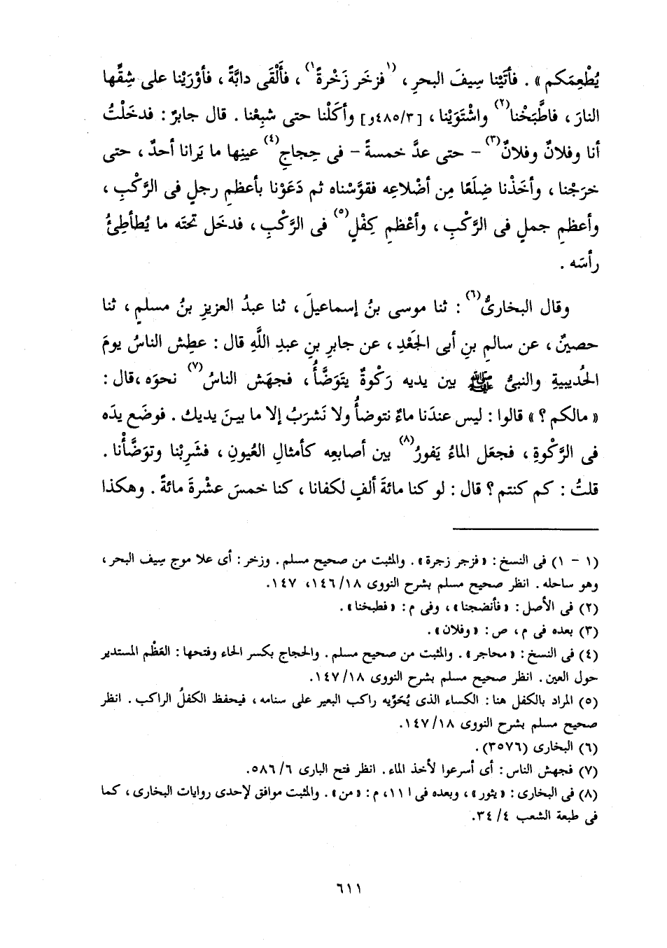 يُطْعِمَكُمْ ". فَأَتَيْنَا سَيْفَ الْبَحْرِ، فَزَخَرَ زَخْرَةً، فَأَلْقَى دَابَّةً، فَأَوْرَيْنَا عَلَى شَقِّهَا النَّارَ، فَاطَّبَخْنَا وَاشْتَوَيْنَا، وَأَكَلْنَا حَتَّى شَبِعْنَا. قَالَ جَابِرٌ: فَدَخَلْتُ أَنَا وَفُلَانٌ وَفُلَانٌ - حَتَّى عَدَّ خَمْسَةً - فِي حِجَاجِ عَيْنِهَا مَا يَرَانَا أَحَدٌ حَتَّى خَرَجْنَا، وَأَخَذْنَا ضِلْعًا مِنْ أَضْلَاعِهِ فَقَوَّسْنَاهُ ثُمَّ دَعَوْنَا بِأَعْظَمِ رَجُلٍ فِي الرَّكْبِ، وَأَعْظَمِ جَمَلٍ فِي الرَّكْبِ، وَأَعْظَمَ كِفْلٍ فِي الرَّكْبِ، فَدَخَلَ تَحْتَهُ مَا يُطَأْطِئُ رَأْسَهُ.» .