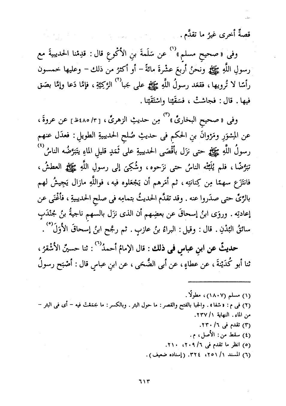 وَفِي " صَحِيحِ مُسْلِمٍ " عَنْ سَلَمَةَ بْنِ الْأَكْوَعِ قَالَ: «قَدِمْنَا الْحُدَيْبِيَةَ مَعَ رَسُولِ اللَّهِ صَلَّى اللَّهُ عَلَيْهِ وَسَلَّمَ، وَنَحْنُ أَرْبَعَ عَشْرَةَ مِائَةً - أَوْ أَكْثَرُ مِنْ ذَلِكَ - وَعَلَيْهَا خَمْسُونَ رَأْسًا لَا تَرْوِيهَا، فَقَعَدَ رَسُولُ اللَّهِ صَلَّى اللَّهُ عَلَيْهِ وَسَلَّمَ عَلَى جَبَا الرَّكِيَّةِ، فَإِمَّا دَعَا وَإِمَّا بَصَقَ فِيهَا. قَالَ: فَجَاشَتْ، فَسَقَيْنَا وَاسْتَقَيْنَا» .