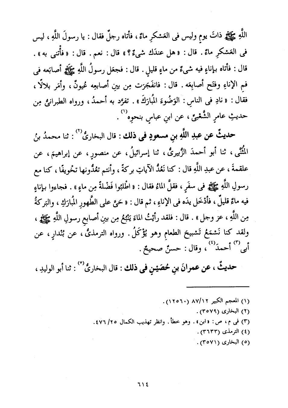 حَدِيثٌ عَنْ عَبْدِ اللَّهِ بْنِ مَسْعُودٍ فِي ذَلِكَ: قَالَ الْبُخَارِيُّ: ثَنَا مُحَمَّدُ بْنُ الْمُثَنَّى، ثَنَا أَبُو أَحْمَدَ الزُّبَيْرِيُّ، ثَنَا إِسْرَائِيلُ، عَنْ مَنْصُورٍ، عَنْ إِبْرَاهِيمَ، عَنْ عَلْقَمَةَ، عَنْ عَبْدِ اللَّهِ قَالَ: «كُنَّا نَعُدُّ الْآيَاتِ بَرَكَةً. وَأَنْتُمْ تُعِدُّونَهَا تَخْوِيفًا، كُنَّا مَعَ رَسُولِ اللَّهِ صَلَّى اللَّهُ عَلَيْهِ وَسَلَّمَ فِي سَفَرٍ، فَقَلَّ الْمَاءُ فَقَالَ: " اطْلُبُوا فَضْلَةً مِنْ مَاءٍ ". فَجَاءُوا بِإِنَاءٍ فِيهِ مَاءٌ قَلِيلٌ فَأَدْخَلَ يَدَهُ فِي الْإِنَاءِ، ثُمَّ قَالَ: " حَيَّ عَلَى الطَّهُورِ الْمُبَارَكِ وَالْبِرْكَةُ مِنَ اللَّهِ عَزَّ وَجَلَّ ". قَالَ: فَلَقَدْ رَأَيْتُ الْمَاءَ يَنْبُعُ مِنْ بَيْنِ أَصَابِعِ رَسُولِ اللَّهِ صَلَّى اللَّهُ عَلَيْهِ وَسَلَّمَ وَلَقَدْ كُنَّا نَسْمَعُ تَسْبِيحَ الطَّعَامِ وَهُوَ يُؤْكَلُ» وَرَوَاهُ التِّرْمِذِيُّ، عَنْ بُنْدَارٍ، عَنْ أَبِي أَحْمَدَ، وَقَالَ: حَسَنٌ صَحِيحٌ.