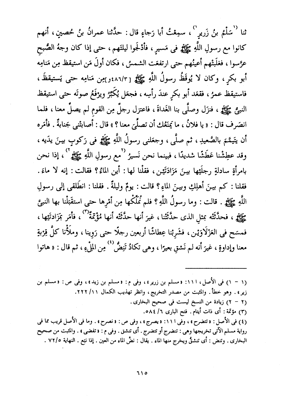 ثَنَا سَلْمُ بْنُ زَرِيرٍ، سَمِعْتُ أَبَا رَجَاءٍ قَالَ: «حَدَّثَنَا عِمْرَانُ بْنُ حُصَيْنٍ، أَنَّهُمْ كَانُوا مَعَ رَسُولِ اللَّهِ صَلَّى اللَّهُ عَلَيْهِ وَسَلَّمَ فِي مَسِيرٍ، فَأَدْلَجُوا لَيْلَتَهُمْ، حَتَّى إِذَا كَانَ وَجْهُ الصُّبْحِ عَرَّسُوا، فَغَلَبَتْهُمْ أَعْيُنُهُمْ حَتَّى ارْتَفَعَتِ الشَّمْسُ، فَكَانَ أَوَّلَ مَنِ اسْتَيْقَظَ مِنْ مَنَامِهِ أَبُو بَكْرٍ، وَكَانَ لَا يُوقِظُ رَسُولَ اللَّهِ صَلَّى اللَّهُ عَلَيْهِ وَسَلَّمَ مِنْ مَنَامِهِ حَتَّى يَسْتَيْقِظَ، فَاسْتَيْقَظَ عُمَرُ، فَقَعَدَ أَبُو بَكْرٍ عِنْدَ رَأْسِهِ، فَجَعَلَ يُكَبِّرُ وَيَرْفَعُ صَوْتَهُ حَتَّى اسْتَيْقَظَ النَّبِيُّ صَلَّى اللَّهُ عَلَيْهِ وَسَلَّمَ، فَنَزَلَ وَصَلَّى بِنَا الْغَدَاةَ، فَاعْتَزَلَ رَجُلٌ مِنَ الْقَوْمِ لَمْ يُصَلِّ مَعَنَا، فَلَمَّا انْصَرَفَ قَالَ: " يَا فُلَانُ، مَا يَمْنَعُكَ أَنْ تُصَلِّيَ مَعَنَا؟ " قَالَ: أَصَابَتْنِي جَنَابَةٌ. فَأَمَرَهُ أَنْ يَتَيَمَّمَ بِالصَّعِيدِ، ثُمَّ صَلَّى، وَجَعَلَنِي رَسُولُ اللَّهِ صَلَّى اللَّهُ عَلَيْهِ وَسَلَّمَ فِي رَكُوبٍ بَيْنَ يَدَيْهِ، وَقَدْ عَطِشْنَا عَطَشًا شَدِيدًا، فَبَيْنَمَا نَحْنُ نَسِيرُ مَعَ رَسُولِ اللَّهِ صَلَّى اللَّهُ عَلَيْهِ وَسَلَّمَ، إِذَا نَحْنُ بِامْرَأَةٍ سَادِلَةٍ رِجْلَيْهَا بَيْنَ مَزَادَتَيْنِ، فَقُلْنَا لَهَا: أَيْنَ الْمَاءُ؟ فَقَالَتْ: إِنَّهُ لَا مَاءَ. فَقُلْنَا: كَمْ بَيْنَ أَهْلِكِ وَبَيْنَ الْمَاءِ؟ قَالَتْ: يَوْمٌ وَلَيْلَةٌ. فَقُلْنَا: انْطَلِقِي إِلَى رَسُولِ اللَّهِ صَلَّى اللَّهُ عَلَيْهِ وَسَلَّمَ. قَالَتْ: وَمَا رَسُولُ اللَّهِ؟ فَلَمْ نُمَلِّكْهَا مِنْ أَمْرِهَا حَتَّى اسْتَقْبَلْنَا بِهَا النَّبِيَّ صَلَّى اللَّهُ عَلَيْهِ وَسَلَّمَ فَحَدَّثَتْهُ بِمِثْلِ الَّذِي حَدَّثَتْنَا، غَيْرَ أَنَّهَا حَدَّثَتْهُ أَنَّهَا مُؤْتِمَةٌ، فَأَمَرَ بِمَزَادَتَيْهَا، فَمَسَحَ فِي الْعَزْلَاوَيْنِ، فَشَرِبْنَا عِطَاشًا أَرْبَعِينَ رَجُلًا حَتَّى رَوِينَا، وَمَلَأْنَا كُلَّ قِرْبَةٍ مَعَنَا وَإِدَاوَةٍ، غَيْرَ أَنَّهُ لَمْ نَسْقِ بَعِيرًا، وَهِيَ تَكَادُ تَنِضُّ مِنَ الْمِلْءِ ثُمَّ قَالَ: " هَاتُوا