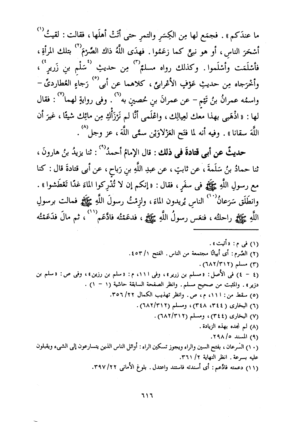 مَا عِنْدَكُمْ ". فَجَمَعَ لَهَا مِنَ الْكِسَرِ وَالتَّمْرِ حَتَّى أَتَتْ أَهْلَهَا، قَالَتْ: لَقِيتُ أَسْحَرَ النَّاسِ، أَوْ هُوَ نَبِيٌّ كَمَا زَعَمُوا. فَهَدَى اللَّهُ ذَاكَ الصِّرْمِ بِتِلْكَ الْمَرْأَةِ، فَأَسْلَمَتْ وَأَسْلَمُوا.» وَكَذَلِكَ رَوَاهُ مُسْلِمٌ مِنْ حَدِيثِ سَلْمِ بْنِ زَرِيرٍ، وَأَخْرَجَاهُ مِنْ حَدِيثِ عَوْفٍ الْأَعْرَابِيِّ، كِلَاهُمَا عَنْ أَبِي رَجَاءٍ الْعُطَارِدِيِّ - وَاسْمُهُ عِمْرَانُ بْنُ تَيْمٍ - عَنْ عِمْرَانَ بْنِ حُصَيْنٍ بِهِ. وَفِي رِوَايَةٍ لَهُمَا: فَقَالَ لَهَا: " «اذْهَبِي بِهَذَا مَعَكِ لِعِيَالِكِ، وَاعْلَمِي أَنَّا لَمْ نَرْزَأْكِ مِنْ مَائِكِ شَيْئًا، غَيْرَ أَنَّ اللَّهَ سَقَانَا» ". وَفِيهِ أَنَّهُ لَمَّا فَتَحَ الْعَزْلَاوَيْنِ سَمَّى اللَّهَ عَزَّ وَجَلَّ.
