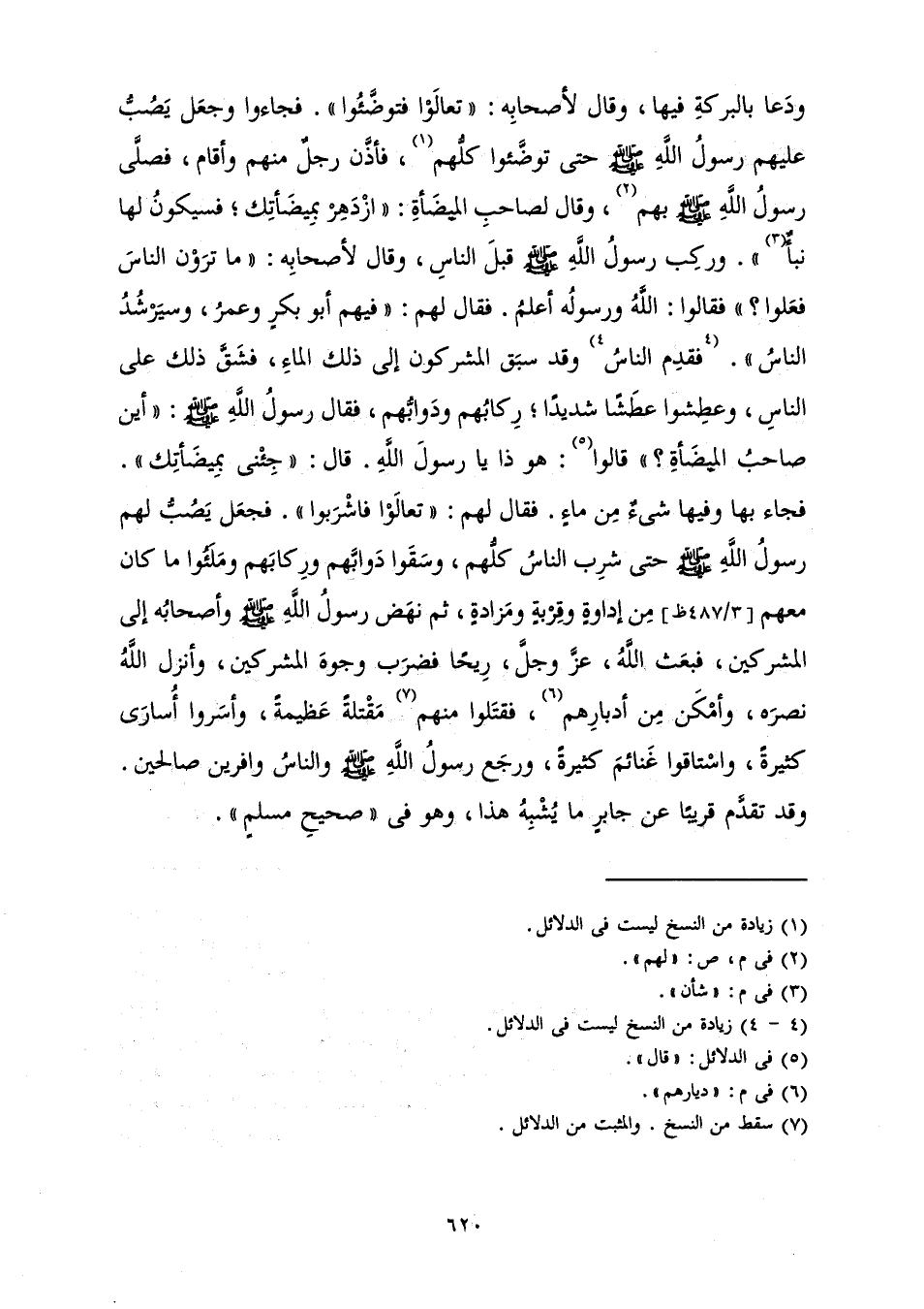 وَدَعَا بِالْبَرَكَةِ فِيهَا، وَقَالَ لِأَصْحَابِهِ: " تَعَالَوْا فَتَوَضَّؤُوا " فَجَاءُوا وَجَعَلَ يَصُبُّ عَلَيْهِمْ رَسُولُ اللَّهِ صَلَّى اللَّهُ عَلَيْهِ وَسَلَّمَ حَتَّى تَوَضَّؤُوا كُلُّهُمْ، فَأَذَّنَ رَجُلٌ مِنْهُمْ وَأَقَامَ، فَصَلَّى رَسُولُ اللَّهِ صَلَّى اللَّهُ عَلَيْهِ وَسَلَّمَ بِهِمْ، وَقَالَ لِصَاحِبِ الْمِيضَأَةِ: " ازْدَهِرْ بِمِيضَأَتِكَ فَسَيَكُونُ لَهَا نَبَأٌ ". وَرَكِبَ رَسُولُ اللَّهِ صَلَّى اللَّهُ عَلَيْهِ وَسَلَّمَ قَبْلَ النَّاسِ، وَقَالَ لِأَصْحَابِهِ: " مَا تَرَوْنَ النَّاسَ فَعَلُوا؟ " فَقَالُوا: اللَّهُ وَرَسُولُهُ أَعْلَمُ. فَقَالَ لَهُمْ: " فِيهِمْ أَبُو بَكْرٍ وَعُمَرُ، وَسَيَرْشُدُ النَّاسُ ". فَقَدِمَ النَّاسُ وَقَدْ سَبَقَ الْمُشْرِكُونَ إِلَى ذَلِكَ الْمَاءِ، فَشَقَّ ذَلِكَ عَلَى النَّاسِ، وَعَطِشُوا عَطَشًا شَدِيدًا؛ رِكَابُهُمْ وَدَوَابُّهُمْ، فَقَالَ رَسُولُ اللَّهِ صَلَّى اللَّهُ عَلَيْهِ وَسَلَّمَ: " أَيْنَ صَاحِبُ الْمِيضَأَةِ؟ " قَالُوا: هُوَ ذَا يَا رَسُولَ اللَّهِ. قَالَ: " جِئْنِي بِمِيضَأَتِكَ ". فَجَاءَ بِهَا وَفِيهَا شَيْءٌ مِنْ مَاءٍ. فَقَالَ لَهُمْ: " تَعَالَوْا فَاشْرَبُوا ". فَجَعَلَ يَصُبُّ لَهُمْ رَسُولُ اللَّهِ صَلَّى اللَّهُ عَلَيْهِ وَسَلَّمَ حَتَّى شَرِبَ النَّاسُ كُلُّهُمْ، وَسَقَوْا دَوَابَّهُمْ وَرِكَابَهُمْ وَمَلَؤُوا مَا كَانَ مَعَهُمْ مِنْ إِدَاوَةٍ وَقِرْبَةٍ وَمَزَادَةٍ، ثُمَّ نَهَضَ رَسُولُ اللَّهِ صَلَّى اللَّهُ عَلَيْهِ وَسَلَّمَ وَأَصْحَابُهُ إِلَى الْمُشْرِكِينَ، فَبَعَثَ اللَّهُ، عَزَّ وَجَلَّ، رِيحًا فَضَرَبَ وُجُوهَ الْمُشْرِكِينَ، وَأَنْزَلَ اللَّهُ نَصْرَهُ، وَأَمْكَنَ مِنْ أَدْبَارِهِمْ، فَقَتَلُوا مِنْهُمْ مَقْتَلَةً عَظِيمَةً، وَأَسَرُوا أُسَارَى كَثِيرَةً، وَاسْتَاقُوا غَنَائِمَ كَثِيرَةً، وَرَجَعَ رَسُولُ اللَّهِ صَلَّى اللَّهُ عَلَيْهِ وَسَلَّمَ وَالنَّاسُ وَافِرِينَ صَالِحِينَ» . وَقَدْ تَقَدَّمَ قَرِيبًا عَنْ جَابِرٍ مَا يُشْبِهُ هَذَا، وَهُوَ فِي " صَحِيحِ مُسْلِمٍ ".