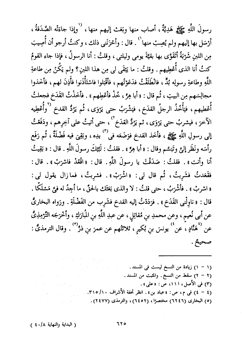 رَسُولَ اللَّهِ صَلَّى اللَّهُ عَلَيْهِ وَسَلَّمَ هَدِيَّةٌ، أَصَابَ مِنْهَا وَبَعَثَ إِلَيْهِمْ مِنْهَا، وَإِذَا جَاءَتْهُ الصَّدَقَةُ، أَرْسَلَ بِهَا إِلَيْهِمْ وَلَمْ يُصِبْ مِنْهَا. قَالَ: وَأَحْزَنَنِي ذَلِكَ، وَكُنْتُ أَرْجُو أَنْ أُصِيبَ مِنَ اللَّبَنِ شَرْبَةً أَتَقَوَّى بِهَا بَقِيَّةَ يَوْمِي وَلَيْلَتِي، وَقُلْتُ: أَنَا الرَّسُولُ، فَإِذَا جَاءَ الْقَوْمُ كُنْتُ أَنَا الَّذِي أُعْطِيهِمْ. وَقُلْتُ: مَا يَبْقَى لِي مِنْ هَذَا اللَّبَنِ؟ وَلَمْ يَكُنْ مِنْ طَاعَةِ اللَّهِ وَطَاعَةِ رَسُولِهِ بُدٌّ، فَانْطَلَقْتُ فَدَعَوْتُهُمْ، فَأَقْبَلُوا فَاسْتَأْذَنُوا فَأَذِنَ لَهُمْ، فَأَخَذُوا مَجَالِسَهُمْ مِنَ الْبَيْتِ، ثُمَّ قَالَ: " أَبَا هِرٍّ خُذْ فَأَعْطِهِمْ ". فَأَخَذْتُ الْقَدَحَ فَجَعَلْتُ أُعْطِيهِمْ، فَيَأْخُذُ الرَّجُلُ الْقَدَحَ، فَيَشْرَبُ حَتَّى يَرْوَى، ثُمَّ يَرُدُّ الْقَدَحَ، وَأُعْطِيهِ الْآخَرَ، فَيَشْرَبُ حَتَّى يَرْوَى، ثُمَّ يَرُدُّ الْقَدَحَ، حَتَّى أَتَيْتُ عَلَى آخِرِهِمْ، وَدَفَعْتُ إِلَى رَسُولِ اللَّهِ صَلَّى اللَّهُ عَلَيْهِ وَسَلَّمَ، فَأَخَذَ الْقَدَحَ فَوَضَعَهُ فِي يَدِهِ، وَبَقِيَ فِيهِ فَضْلَةٌ، ثُمَّ رَفَعَ رَأْسَهُ وَنَظَرَ إِلَيَّ وَتَبَسَّمَ وَقَالَ: " أَبَا هِرٍّ ". فَقُلْتُ: لَبَّيْكَ رَسُولَ اللَّهِ. قَالَ: " بَقِيتُ أَنَا وَأَنْتَ " فَقُلْتُ: صَدَقْتَ يَا رَسُولَ اللَّهِ. قَالَ: " اقْعُدْ فَاشْرَبْ ". قَالَ: فَقَعَدْتُ فَشَرِبْتُ، ثُمَّ قَالَ لِي: " اشْرَبْ " فَشَرِبْتُ، فَمَا زَالَ يَقُولُ لِي: " اشْرَبْ " فَأَشْرَبُ، حَتَّى قُلْتُ: لَا وَالَّذِي بَعَثَكَ بِالْحَقِّ مَا أَجِدُ لَهُ فِيَّ مَسْلَكًا. قَالَ: " نَاوِلْنِي الْقَدَحِ ". فَرَدَدْتُ إِلَيْهِ الْقَدَحَ فَشَرِبَ مِنَ الْفَضْلَةِ» . وَرَوَاهُ الْبُخَارِيُّ عَنْ أَبِي نُعَيْمٍ، وَعَنْ مُحَمَّدِ بْنِ مُقَاتِلٍ، عَنْ عَبْدِ اللَّهِ بْنِ الْمُبَارَكِ، وَأَخْرَجَهُ التِّرْمِذِيُّ، عَنْ هَنَّادٍ عَنْ يُونُسَ بْنِ بُكَيْرٍ، ثَلَاثَتُهُمْ عَنْ عُمَرَ بْنِ ذَرٍّ. وَقَالَ التِّرْمِذِيُّ: صَحِيحٌ.