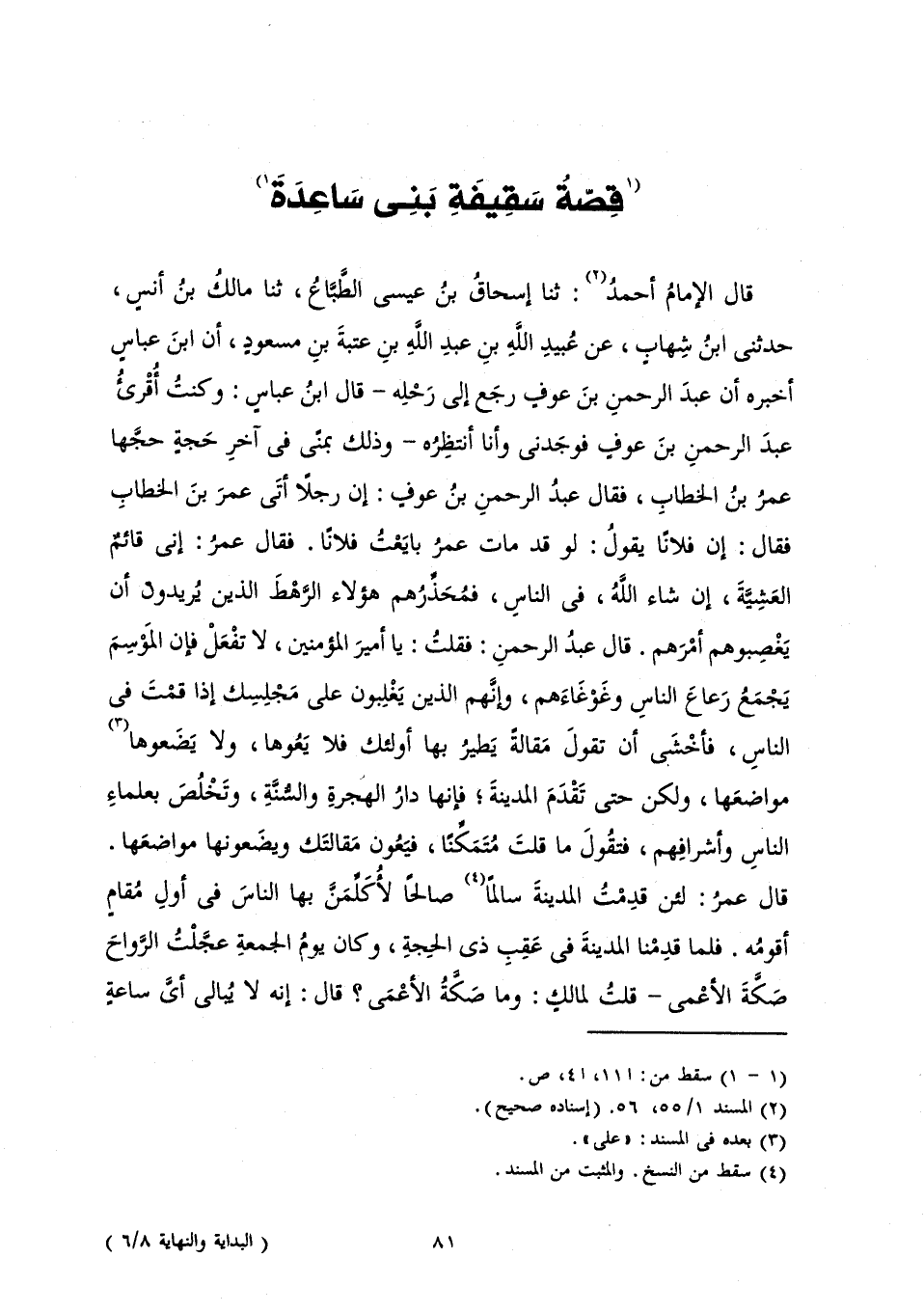 قَالَ الْإِمَامُ أَحْمَدُ: ثَنَا إِسْحَاقُ بْنُ عِيسَى الطَّبَّاعُ، ثَنَا مَالِكُ بْنُ أَنَسٍ، حَدَّثَنِي ابْنُ شِهَابٍ، عَنْ عُبَيْدِ اللَّهِ بْنِ عَبْدِ اللَّهِ بْنِ عُتْبَةَ بْنِ مَسْعُودٍ، أَنَّ ابْنَ عَبَّاسٍ أَخْبَرَهُ أَنَّ عَبْدَ الرَّحْمَنِ بْنَ عَوْفٍ رَجَعَ إِلَى رَحْلِهِ - قَالَ ابْنُ عَبَّاسٍ: وَكُنْتُ أُقْرِئُ عَبْدَ الرَّحْمَنِ بْنَ عَوْفٍ فَوَجَدَنِي وَأَنَا أَنْتَظِرُهُ - وَذَلِكَ بِمِنًى فِي آخِرِ حَجَّةٍ حَجَّهَا عُمَرُ بْنُ الْخَطَّابِ، فَقَالَ عَبْدُ الرَّحْمَنِ بْنُ عَوْفٍ: إِنَّ رَجُلًا أَتَى عُمَرَ بْنَ الْخَطَّابِ فَقَالَ: إِنَّ فُلَانًا يَقُولُ: لَوْ قَدْ مَاتَ عُمَرُ بَايَعْتُ فُلَانًا. فَقَالَ عُمَرُ: إِنِّي قَائِمٌ الْعَشِيَّةَ، إِنْ شَاءَ اللَّهُ، فِي النَّاسِ، فَمُحَذِّرُهُمْ هَؤُلَاءِ الرَّهْطَ الَّذِينَ يُرِيدُونَ أَنْ يَغْصِبُوهُمْ أَمْرَهُمْ. قَالَ عَبْدُ الرَّحْمَنِ: فَقُلْتُ: يَا أَمِيرَ الْمُؤْمِنِينَ، لَا تَفْعَلْ فَإِنَّ الْمَوْسِمَ يَجْمَعُ رِعَاعَ النَّاسِ وَغَوْغَاءَهُمْ، وَإِنَّهُمُ الَّذِينَ يَغْلِبُونَ عَلَى مَجْلِسِكَ إِذَا قُمْتَ فِي النَّاسِ، فَأَخْشَى أَنْ تَقُولَ مَقَالَةً يَطِيرُ بِهَا أُولَئِكَ فَلَا يَعُوهَا، وَلَا يَضَعُوهَا مَوَاضِعَهَا، وَلَكِنْ حَتَّى تَقْدَمَ الْمَدِينَةَ ; فَإِنَّهَا دَارُ الْهِجْرَةِ وَالسُّنَّةِ، وَتَخْلُصُ بِعُلَمَاءِ النَّاسِ وَأَشْرَافِهِمْ، فَتَقُولُ مَا قُلْتَ مُتَمَكِّنًا، فَيَعُونَ مَقَالَتَكَ وَيَضَعُونَهَا مَوَاضِعَهَا. قَالَ عُمَرُ: لَئِنْ قَدِمْتُ الْمَدِينَةَ سَالِمًا صَالِحًا لَأُكَلِّمَنَّ بِهَا النَّاسَ فِي أَوَّلِ مَقَامٍ أَقُومُهُ. فَلَمَّا قَدِمْنَا الْمَدِينَةَ فِي عَقِبِ ذِي الْحِجَّةِ، وَكَانَ يَوْمَ الْجُمُعَةَ عَجَّلْتُ الرَّوَاحَ صَكَّةَ الْأَعْمَى - قُلْتُ لِمَالِكٍ: وَمَا صَكَّةُ الْأَعْمَى؟ قَالَ: إِنَّهُ لَا يُبَالِي أَيَّ سَاعَةً