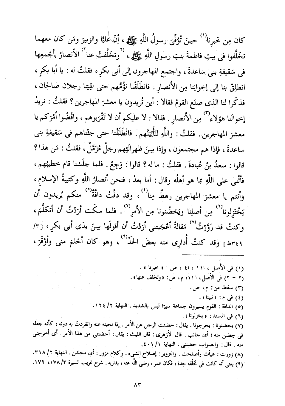 كَانَ مِنْ خَبَرِنَا حِينَ تُوُفِّيَ رَسُولُ اللَّهِ صَلَّى اللَّهُ عَلَيْهِ وَسَلَّمَ، أَنَّ عَلِيًّا وَالزُّبَيْرَ وَمَنْ كَانَ مَعَهُمَا تَخَلَّفُوا فِي بَيْتِ فَاطِمَةَ بِنْتِ رَسُولِ اللَّهِ صَلَّى اللَّهُ عَلَيْهِ وَسَلَّمَ، وَتَخَلَّفَتْ عَنَّا الْأَنْصَارُ بِأَجْمَعِهَا فِي سَقِيفَةِ بَنِي سَاعِدَةَ، وَاجْتَمَعَ الْمُهَاجِرُونَ إِلَى أَبِي بَكْرٍ، فَقُلْتُ لَهُ: يَا أَبَا بَكْرٍ، انْطَلِقْ بِنَا إِلَى إِخْوَانِنَا مِنَ الْأَنْصَارِ. فَانْطَلَقْنَا نَؤُمُّهُمْ حَتَّى لَقِيَنَا رَجُلَانِ صَالِحَانِ، فَذَكَرَا لَنَا الَّذِي صَنَعَ الْقَوْمُ فَقَالَا: أَيْنَ تُرِيدُونَ يَا مَعْشَرَ الْمُهَاجِرِينَ؟ فَقُلْتُ: نُرِيدُ إِخْوَانَنَا هَؤُلَاءِ مِنَ الْأَنْصَارِ. فَقَالَا: لَا عَلَيْكُمْ أَنْ لَا تَقْرَبُوهُمْ، وَاقْضُوا أَمْرَكُمْ يَا مَعْشَرَ الْمُهَاجِرِينَ. فَقُلْتُ: وَاللَّهِ لَنَأْتِيَّنَهُمْ. فَانْطَلَقْنَا حَتَّى جِئْنَاهُمْ فِي سَقِيفَةِ بَنِي سَاعِدَةَ، فَإِذَا هُمْ مُجْتَمِعُونَ، وَإِذَا بَيْنَ ظَهْرَانَيْهِمْ رَجُلٌ مُزَّمَّلٌ، فَقُلْتُ: مَنْ هَذَا؟ قَالُوا: سَعْدُ بْنُ عُبَادَةَ فَقُلْتُ: مَا لَهُ؟ قَالُوا: وَجِعٌ. فَلَمَّا جَلَسْنَا قَامَ خَطِيبُهُمْ، فَأَثْنَى عَلَى اللَّهِ بِمَا هُوَ أَهْلُهُ وَقَالَ: أَمَّا بَعْدُ، فَنَحْنُ أَنْصَارُ اللَّهِ وَكَتِيبَةُ الْإِسْلَامِ، وَأَنْتُمْ يَا مَعْشَرَ الْمُهَاجِرِينَ رَهْطٌ مِنَّا، وَقَدْ دَفَّتْ دَافَّةٌ مِنْكُمْ يُرِيدُونَ أَنْ يَخْتَزِلُونَا مِنْ أَصْلِنَا وَيَحْضُنُونَا مِنَ الْأَمْرِ. فَلَمَّا سَكَتَ أَرَدْتُ أَنْ أَتَكَلَّمَ، وَكُنْتُ قَدْ زَوَّرْتُ مَقَالَةً أَعْجَبَتْنِي أَرَدْتُ أَنْ أَقُولَهَا بَيْنَ يَدَيْ أَبِي بَكْرٍ، وَقَدْ كُنْتُ أُدَارِي مِنْهُ بَعْضَ الْحَدِّ، وَهُوَ كَانَ أَحْلَمَ مِنِّي وَأَوْقَرَ،