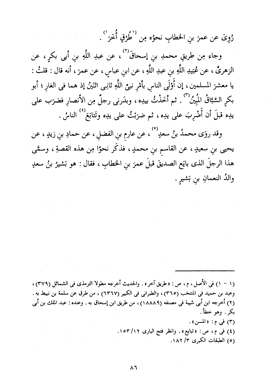 وَقَدْ رَوَى مُحَمَّدُ بْنُ سَعْدٍ، عَنْ عَارِمِ بْنِ الْفَضْلِ، عَنْ حَمَّادِ بْنِ زَيْدٍ، عَنْ يَحْيَى بْنِ سَعِيدٍ، عَنِ الْقَاسِمِ بْنِ مُحَمَّدٍ، فَذَكَرَ نَحْوًا مِنْ هَذِهِ الْقِصَّةِ، وَسَمَّى هَذَا الرَّجُلَ الَّذِي بَايَعَ الصِّدِّيقَ قَبْلَ عُمَرَ بْنِ الْخَطَّابِ، فَقَالَ: هُوَ بَشِيرُ بْنُ سَعْدٍ وَالِدُ النُّعْمَانِ بْنِ بَشِيرٍ