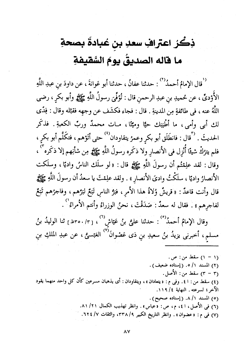 قَالَ الْإِمَامُ أَحْمَدُ: حَدَّثَنَا عَفَّانُ، حَدَّثَنَا أَبُو عَوَانَةَ، عَنْ دَاوُدَ بْنِ عَبْدِ اللَّهِ الْأَوْدِيِّ، عَنْ حُمَيْدِ بْنِ عَبْدِ الرَّحْمَنِ قَالَ: تُوُفِّيَ رَسُولُ اللَّهِ صَلَّى اللَّهُ عَلَيْهِ وَسَلَّمَ وَأَبُو بَكْرٍ رَضِيَ اللَّهُ عَنْهُ، فِي طَائِفَةٍ مِنَ الْمَدِينَةِ. قَالَ: فَجَاءَ فَكَشَفَ عَنْ وَجْهِهِ فَقَبَّلَهُ وَقَالَ: فِدًى لَكَ أَبِي وَأُمِّي، مَا أَطْيَبَكَ حَيًّا وَمَيِّتًا، مَاتَ مُحَمَّدٌ وَرَبِّ الْكَعْبَةِ. فَذَكَرَ الْحَدِيثَ. قَالَ: فَانْطَلَقَ أَبُو بَكْرٍ وَعُمَرُ يَتَقَاوَدَانِ حَتَّى أَتَوْهُمْ، فَتَكَلَّمَ أَبُو بَكْرٍ، فَلَمْ يَتْرُكْ شَيْئًا أُنْزِلَ فِي الْأَنْصَارِ وَلَا ذَكَرَهُ رَسُولُ اللَّهِ صَلَّى اللَّهُ عَلَيْهِ وَسَلَّمَ مِنْ شَأْنِهِمْ إِلَّا ذَكَرَهُ، وَقَالَ: لَقَدْ عَلِمْتُمْ أَنَّ رَسُولَ اللَّهِ صَلَّى اللَّهُ عَلَيْهِ وَسَلَّمَ قَالَ «لَوْ سَلَكَ النَّاسُ وَادِيًا، وَسَلَكَتِ الْأَنْصَارُ وَادِيًا، سَلَكْتُ وَادِيَ الْأَنْصَارِ» وَلَقِدْ عَلِمْتَ يَا سَعْدُ أَنَّ رَسُولَ اللَّهِ صَلَّى اللَّهُ عَلَيْهِ وَسَلَّمَ قَالَ وَأَنْتَ قَاعِدٌ: «قُرَيْشٌ وُلَاةُ هَذَا الْأَمْرِ، فَبَرُّ النَّاسِ تَبَعٌ لِبَرِّهِمْ، وَفَاجِرُهُمْ تَبَعٌ لِفَاجِرِهِمْ» فَقَالَ لَهُ سَعْدٌ: صَدَقْتَ نَحْنُ الْوُزَرَاءُ وَأَنْتُمُ الْأُمَرَاءُ.