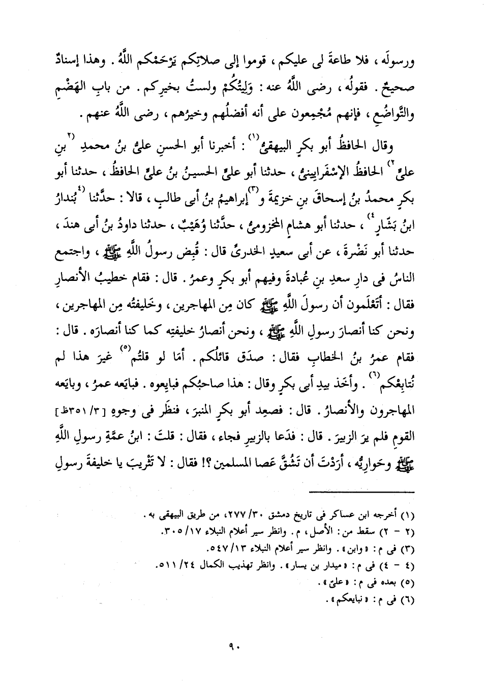 وَقَالَ الْحَافِظُ أَبُو بَكْرٍ الْبَيْهَقِيُّ: أَخْبَرَنَا أَبُو الْحَسَنِ عَلِيُّ بْنُ مُحَمَّدِ بْنِ عَلِيٍّ الْحَافِظُ الْإِسْفَرَايِينِيُّ، حَدَّثَنَا أَبُو عَلِيٍّ الْحُسَيْنُ بْنُ عَلِيٍّ الْحَافِظُ، حَدَّثَنَا أَبُو بَكْرٍ مُحَمَّدُ بْنُ إِسْحَاقَ بْنِ خُزَيْمَةَ وَإِبْرَاهِيمُ بْنُ أَبِي طَالِبٍ، قَالَا: حَدَّثَنَا بُنْدَارُ بْنُ بَشَّارٍ، حَدَّثَنَا أَبُو هِشَامٍ الْمَخْزُومِيُّ، حَدَّثَنَا وُهَيْبٌ، حَدَّثَنَا دَاوُدُ بْنُ أَبِي هِنْدٍ، حَدَّثَنَا أَبُو نَضْرَةَ، عَنْ أَبِي سَعِيدٍ الْخُدْرِيِّ قَالَ: قُبِضَ رَسُولُ اللَّهِ صَلَّى اللَّهُ عَلَيْهِ وَسَلَّمَ، وَاجْتَمَعَ النَّاسُ فِي دَارِ سَعْدِ بْنِ عُبَادَةَ وَفِيهِمْ أَبُو بَكْرٍ وَعُمَرُ. قَالَ: فَقَامَ خَطِيبُ الْأَنْصَارِ فَقَالَ: أَتَعْلَمُونَ أَنَّ رَسُولَ اللَّهِ صَلَّى اللَّهُ عَلَيْهِ وَسَلَّمَ كَانَ مِنَ الْمُهَاجِرِينَ، وَخَلِيفَتُهُ مِنَ الْمُهَاجِرِينَ، وَنَحْنُ كُنَّا أَنْصَارَ رَسُولِ اللَّهِ صَلَّى اللَّهُ عَلَيْهِ وَسَلَّمَ، وَنَحْنُ أَنْصَارُ خَلِيفَتِهِ كَمَا كُنَّا أَنْصَارَهُ. قَالَ: فَقَامَ عُمَرُ بْنُ الْخَطَّابِ فَقَالَ: صَدَقَ قَائِلُكُمْ. أَمَا لَوْ قُلْتُمْ غَيْرَ هَذَا لَمْ نُتَابِعْكُمْ. وَأَخَذَ بِيَدِ أَبِي بَكْرٍ وَقَالَ: هَذَا صَاحِبُكُمْ فَبَايِعُوهُ. فَبَايَعَهُ عُمَرُ، وَبَايَعَهُ الْمُهَاجِرُونَ وَالْأَنْصَارُ. قَالَ: فَصَعِدَ أَبُو بَكْرٍ الْمِنْبَرَ، فَنَظَرَ فِي وُجُوهِ الْقَوْمِ فَلَمْ يَرَ الزُّبَيْرَ. قَالَ: فَدَعَا بِالزُّبَيْرِ فَجَاءَ، فَقَالَ: قُلْتُ: ابْنُ عَمَّةِ رَسُولِ اللَّهِ صَلَّى اللَّهُ عَلَيْهِ وَسَلَّمَ وَحَوَارِيُّهُ، أَرَدْتَ أَنْ تَشُقَّ عَصَا الْمُسْلِمِينَ؟ ! فَقَالَ: لَا تَثْرِيبَ يَا خَلِيفَةَ رَسُولِ