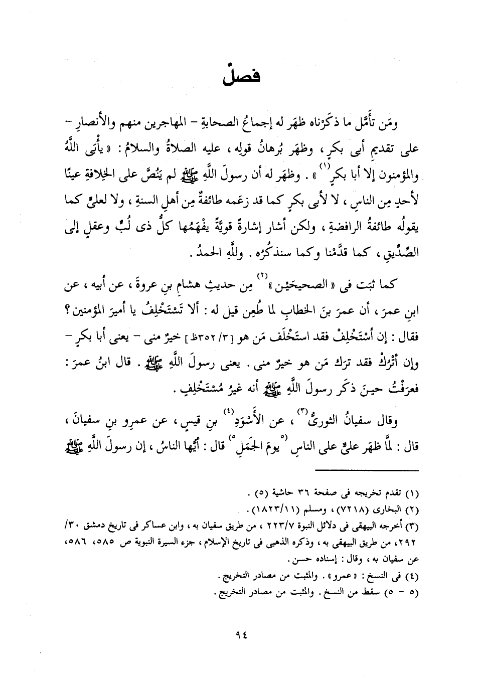 وَمَنْ تَأَمَّلَ مَا ذَكَرْنَاهُ ظَهَرَ لَهُ إِجْمَاعُ الصَّحَابَةِ - الْمُهَاجِرِينَ مِنْهُمْ وَالْأَنْصَارِ - عَلَى تَقْدِيمِ أَبِي بَكْرٍ، وَظَهَرَ بُرْهَانُ قَوْلِهِ عَلَيْهِ الصَّلَاةُ وَالسَّلَامُ: «يَأْبَى اللَّهُ وَالْمُؤْمِنُونَ إِلَّا أَبَا بَكْرٍ ".» وَظَهَرَ لَهُ أَنَّ رَسُولَ اللَّهِ صَلَّى اللَّهُ عَلَيْهِ وَسَلَّمَ لَمْ يَنُصَّ عَلَى الْخِلَافَةِ عَيْنًا لِأَحَدٍ مِنَ النَّاسِ، لَا لِأَبِي بَكْرٍ كَمَا قَدْ زَعَمَهُ طَائِفَةٌ مِنْ أَهْلِ السُّنَّةِ، وَلَا لَعَلِّي كَمَا يَقُولُهُ طَائِفَةُ الرَّافِضَةِ، وَلَكِنْ أَشَارَ إِشَارَةً قَوِيَّةً يَفْهَمُهَا كُلُّ ذِي لُبٍّ وَعَقْلٍ إِلَى الصِّدِّيقِ، كَمَا قَدَّمْنَا وَكَمَا سَنَذْكُرُهُ. وَلِلَّهِ الْحَمْدُ.