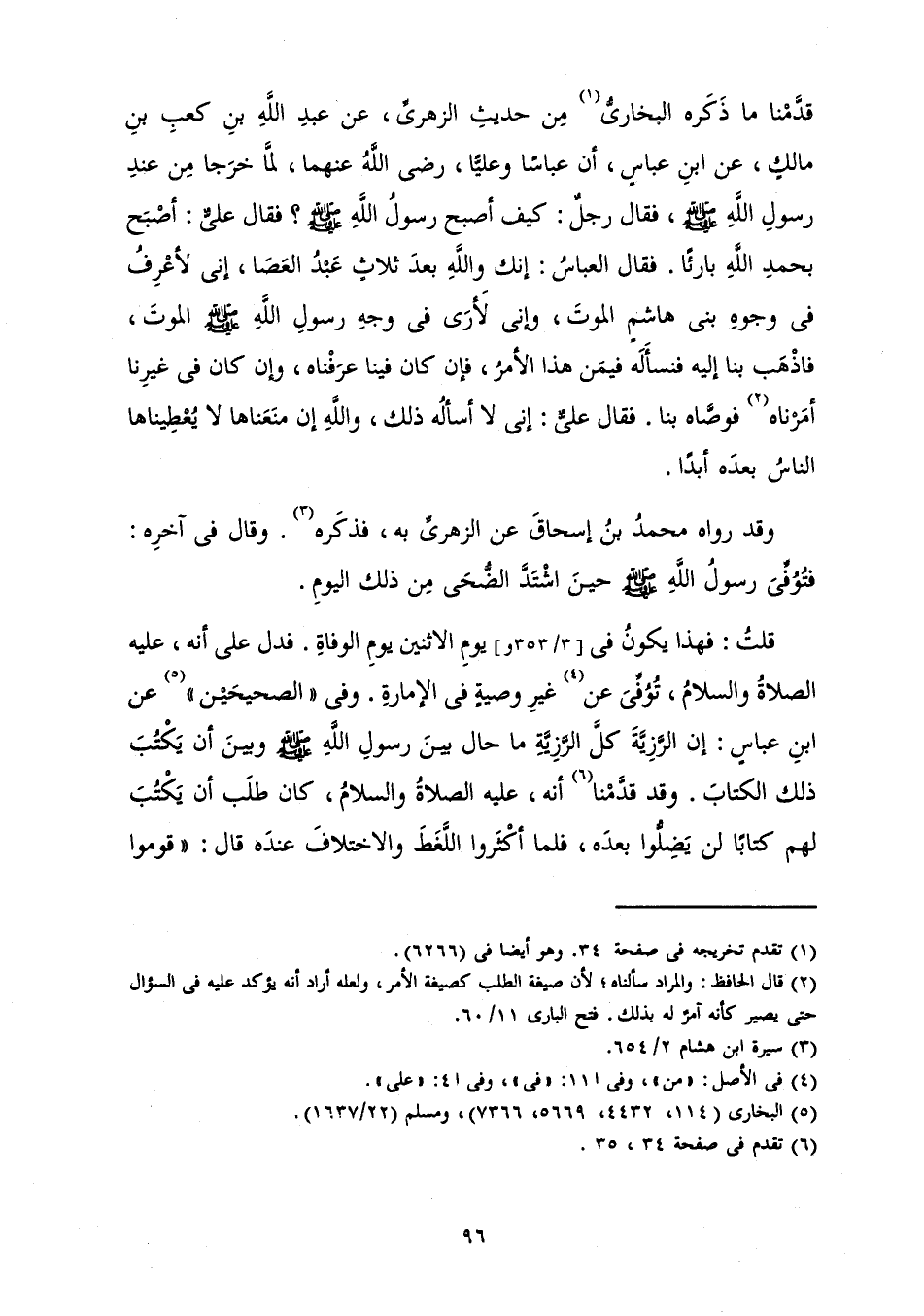 قَدَّمْنَا مَا ذَكَرَهُ الْبُخَارِيُّ مِنْ حَدِيثِ الزُّهْرِيِّ عَنْ عَبْدِ اللَّهِ بْنِ كَعْبِ بْنِ مَالِكٍ، عَنِ ابْنِ عَبَّاسٍ أَنَّ عَبَّاسًا وَعَلِيًّا رَضِيَ اللَّهُ عَنْهُمَا، لَمَّا خَرَجَا مِنْ عِنْدِ رَسُولِ اللَّهِ صَلَّى اللَّهُ عَلَيْهِ وَسَلَّمَ، فَقَالَ رَجُلٌ: كَيْفَ أَصْبَحَ رَسُولُ اللَّهِ صَلَّى اللَّهُ عَلَيْهِ وَسَلَّمَ؟ فَقَالَ عَلِيٌّ: أَصْبَحَ بِحَمْدِ اللَّهِ بَارِئًا. فَقَالَ الْعَبَّاسُ: إِنَّكَ وَاللَّهِ بَعْدَ ثَلَاثٍ عَبْدُ الْعَصَا، إِنِّي لَأَعْرِفُ فِي وُجُوهِ بَنِي هَاشِمٍ الْمَوْتَ، وَإِنِّي لِأَرَى فِي وَجْهِ رَسُولِ اللَّهِ صَلَّى اللَّهُ عَلَيْهِ وَسَلَّمَ الْمَوْتَ، فَاذْهَبْ بِنَا إِلَيْهِ فَنَسْأَلُهُ فَيَمَنْ هَذَا الْأَمْرُ، فَإِنْ كَانَ فِينَا عَرَفْنَاهُ، وَإِنْ كَانَ فِي غَيْرِنَا أَمَرْنَاهُ فَوَصَّاهُ بِنَا. فَقَالَ عَلِيٌّ إِنِّي لَا أَسْأَلُهُ ذَلِكَ، وَاللَّهِ إِنْ مَنَعَنَاهَا لَا يُعْطِينَاهَا النَّاسُ بَعْدَهُ أَبَدًا.